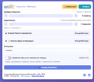 Εκπαιδευτικό παιχνίδι κρυφού ρόλου (τύπου impostor) για τάξεις και ομάδες.