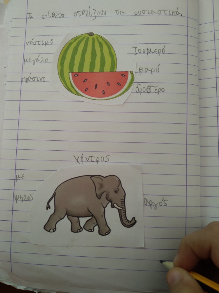 και εξασκηθήκαμε στο τετράδιο όπου έπρεπε να βρούμε ταιριαστά επίθετα για κάποια ουσιαστικά.
