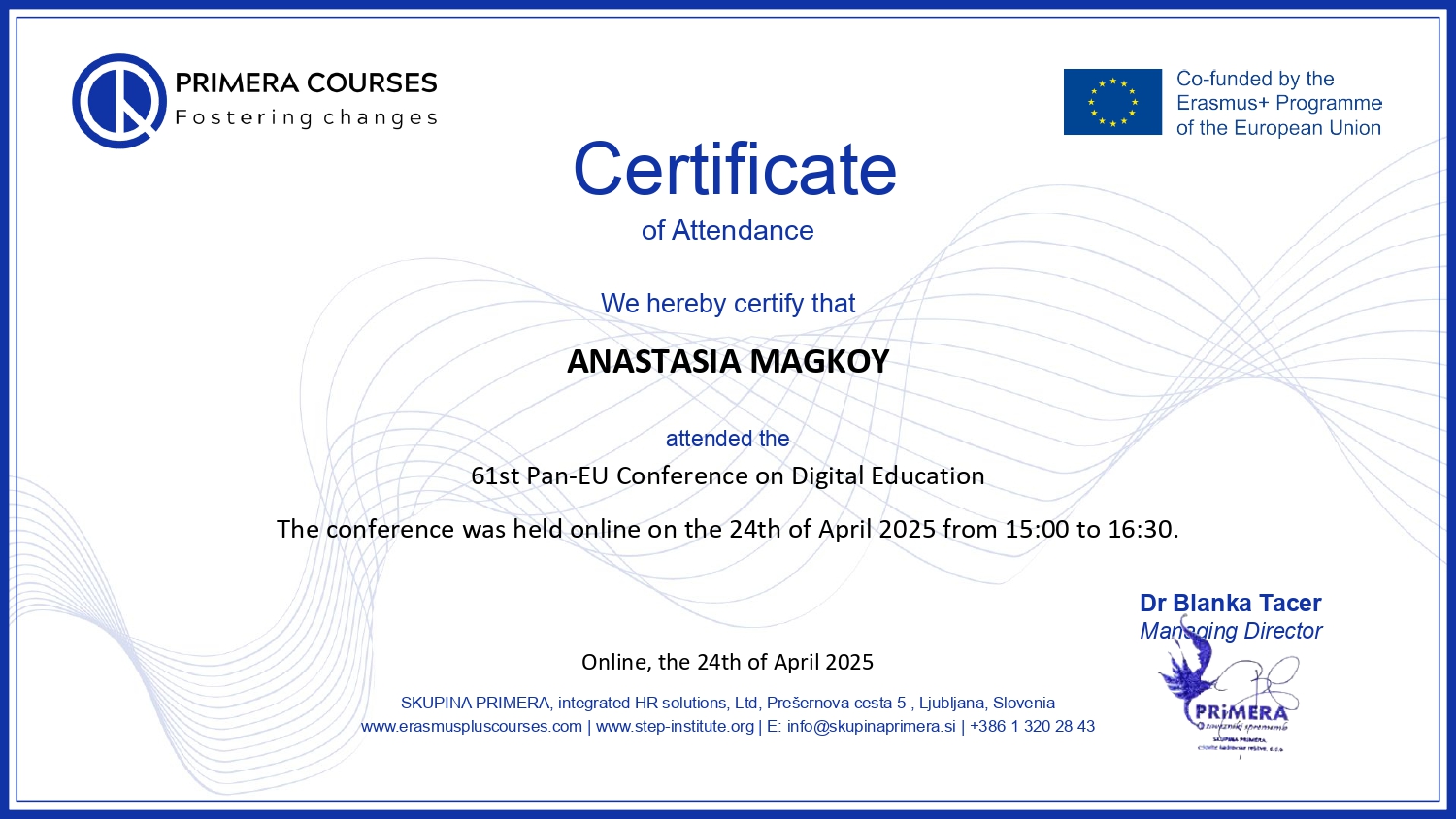 Δρ. Blanka Tacer, Primera Courses