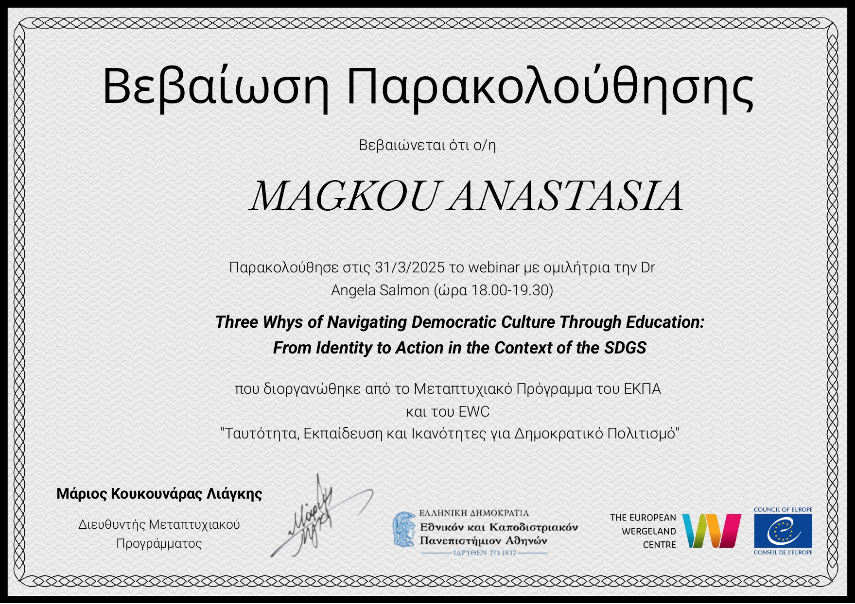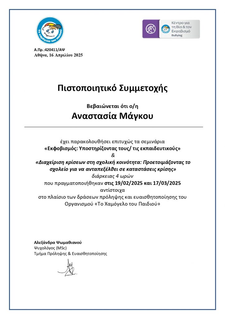 Παρακολούθηση του Επιμορφωτικού Σεμινάριο Εκπαιδευτικών: Ευρωπαϊκή Ημέρα Γλωσσών-Φιλαναγνωσία Πολυγλωσσία την Πέμπτη 25 Σεπτεμβρίου 2025 από την Νηπιαγωγό κα Άννα Μαγκιώση της οποίας τα σεμινάρια ακολουθούν τα υπ΄αριθμόν: