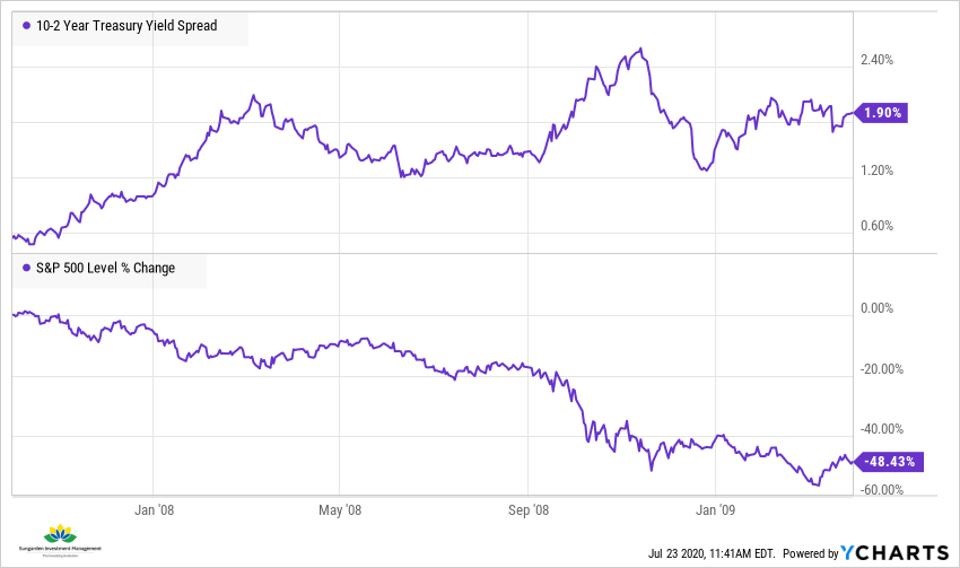 Το δεύτερο διάγραμμα εστιάζει ειδικότερα σε μια τυπική τέτοια περίπτωση. Πρόκειται για την περίοδο της παγκόσμιας χρηματοπιστωτικής κρίσης του 2007-2008. Το εν λόγω διάγραμμα δείχνει αυτό που ακολούθησε ΜΕΤΑ την επαναφορά της καμπύλης των αποδόσεων στην "κανονικότητα”, όταν το spread μεταξύ των αποδόσεων των δύο ομολόγων ανήλθε περίπου στα επίπεδα που είναι και σήμερα (η απόδοση του 10ετούς είναι περίπου μισή ποσοστιαία μονάδα υψηλότερη αυτής του 2ετούς).