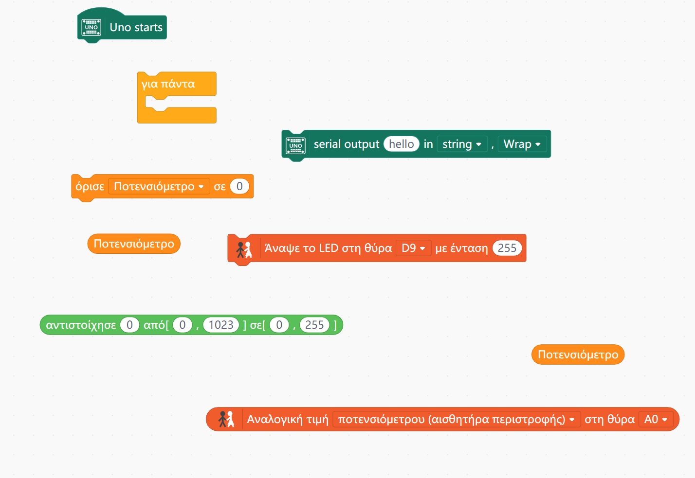 ΠΡΟΣΟΧΗ: 1) Θα πρέπει να δημιουργηθεί μεταβλητή ώστε να αποθηκεύεται η τιμή του ποτενσιόμετρου και να αποδίδεται στο led.  2) Παρατηρείστε επίσης ότι οι τιμές για το λεντ είναι μέχρι 255 ενώ οι τιμές για το ποτενσιόμετρο είναι 1023. Γι΄αυτό θα πρέπει να γίνει αντιστοίχιση των τιμών.