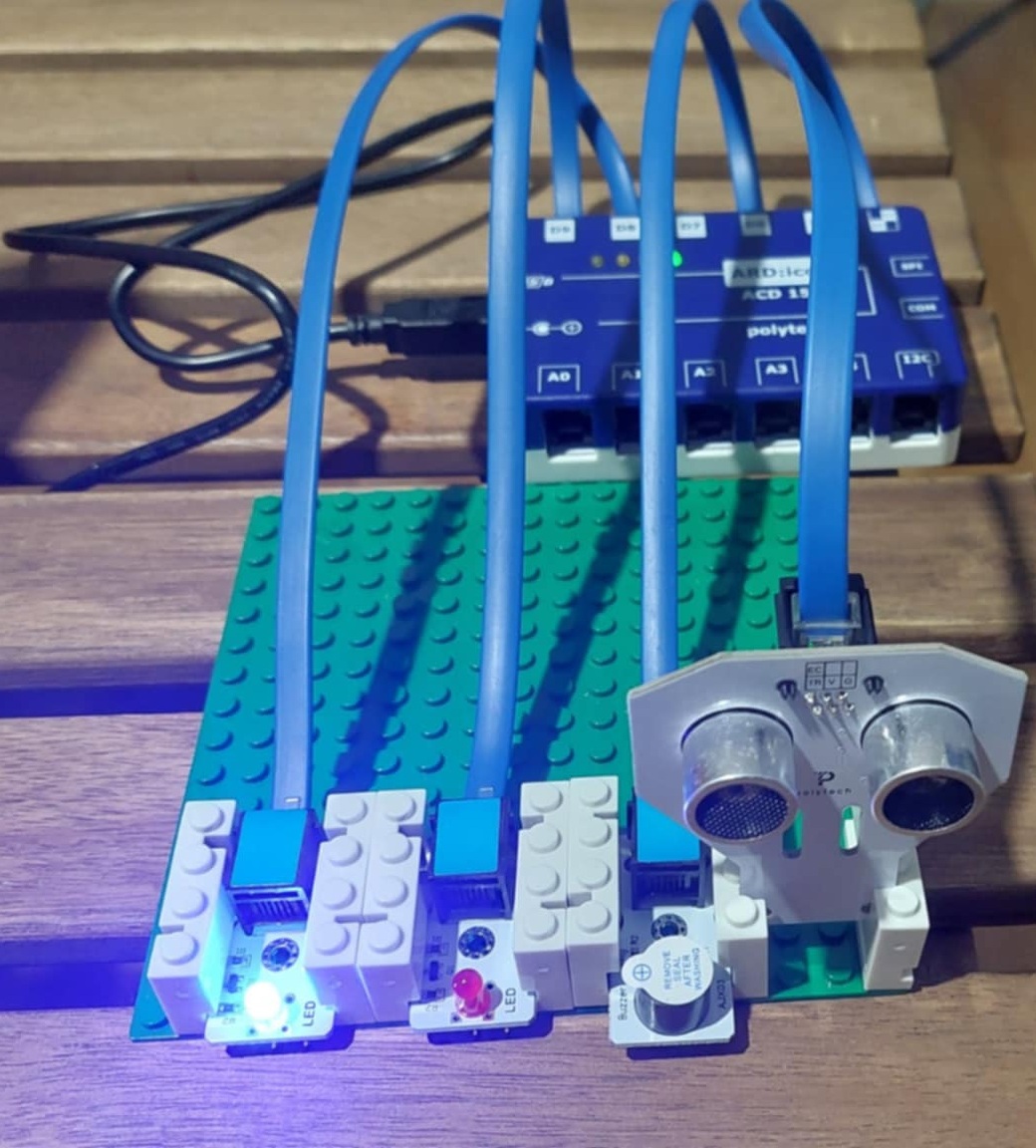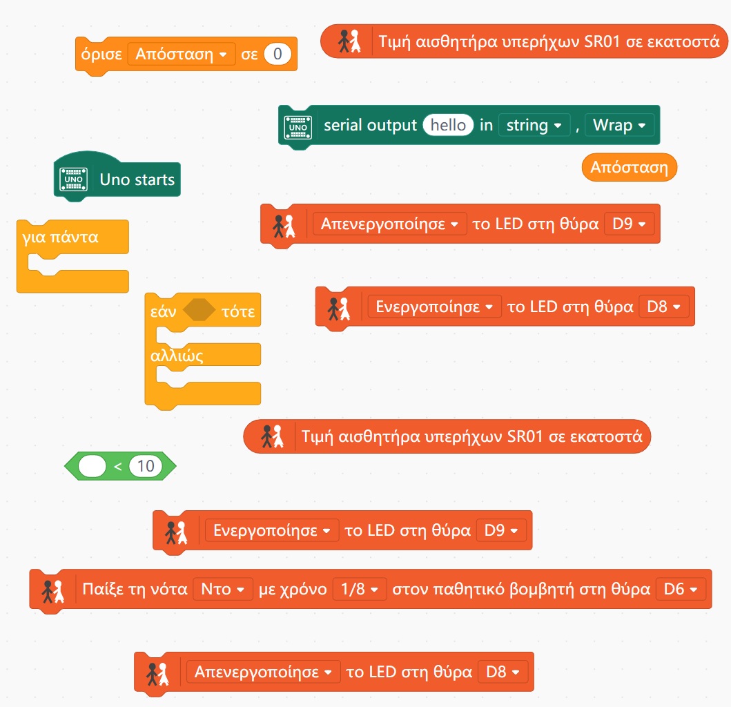 Φροντίστε να συνδυάσετε κατάλληλα τα μπλοκς της διπλανής φωτογραφίας ώστε να ανάβει το κόκκινο led όταν πλησιάζει το εμπόδιο στα 10 εκατοστά και πιο κοντά ενώ παράλληλα να ακούγεται ήχος από το buzzer. Στις αποστάσεις μεγαλύτερες των 10 εκατοστών θα ανάβει το πράσινο φως.