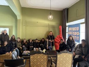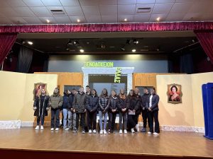 Η κ. Δημοπούλου Πόπη μέλος της θεατρικής ομάδας μας μίλησε για την ίδρυση, τα μέλη, την νέα θεατρική παράσταση που ετοιμάζουν, τις πρόβες τον τρόπο επιλογής των έργων. Επίσης μας επισήμανε ότι λειτουργεί τμήμα με μικρά παιδιά που μαθαίνουν θεατρικό παιχνίδι και τον τρόπο που μπορεί κάποιος να γραφτεί στη θεατρική ομάδα. Ξενάγησε τους μαθητές στα γραφεία της θεατρικής ομάδας και στο χώρο που είχαν στήσει τα σκηνικά του για την νέα παράσταση. Η τηλεφωνική συνεννόηση και καθοδήγηση είχε γίνει από την πρόεδρο Μαρία Κουρέτα.