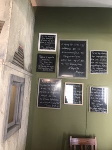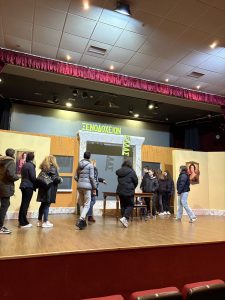 Η κ. Δημοπούλου Πόπη μέλος της θεατρικής ομάδας μας μίλησε για την ίδρυση, τα μέλη, την νέα θεατρική παράσταση που ετοιμάζουν, τις πρόβες τον τρόπο επιλογής των έργων. Επίσης μας επισήμανε ότι λειτουργεί τμήμα με μικρά παιδιά που μαθαίνουν θεατρικό παιχνίδι και τον τρόπο που μπορεί κάποιος να γραφτεί στη θεατρική ομάδα. Ξενάγησε τους μαθητές στα γραφεία της θεατρικής ομάδας και στο χώρο που είχαν στήσει τα σκηνικά του για την νέα παράσταση. Η τηλεφωνική συνεννόηση και καθοδήγηση είχε γίνει από την πρόεδρο Μαρία Κουρέτα.