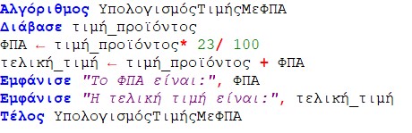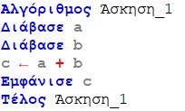 Ένας αλγόριθμος διατυπωμένος σε ψευδογλώσσα αρχίζει πάντα με τη λέξη Αλγόριθμος συνοδευόμενη με το όνομα του αλγορίθμου και τελειώνει με τη λέξη Τέλος συνοδευόμενη επίσης με το όνομα του αλγορίθμου. Η πρώτη ενέργεια που γίνεται είναι η εισαγωγή των δεδομένων. Αυτό επιτυγχάνεται με τη χρήση του ρήματος Διαβάζω σε προστακτική. Η λέξη Διάβασε συνοδεύεται με το όνομα μίας ή περισσοτέρων μεταβλητών, όπως η a και εννοείται ότι μετά την ολοκλήρωση της ενέργειας αυτής, η μεταβλητή a θα έχει λάβει κάποια αριθμητική τιμή ως περιεχόμενο. Κάθε λέξη της χρησιμοποιούμενης ψευδογλώσσας, που προσδιορίζει μια σαφή ενέργεια, θα αποκαλείται στο εξής εντολή. Όλες οι εντολές σε έναν αλγόριθμο αποτυπώνονται με διαφορετικό χρώμα από το όνομα του αλγορίθμου και τις διάφορες σταθερές και μεταβλητές. Μετά την ανάγνωση των τιμών των μεταβλητών a και b γίνεται ο υπολογισμός του αθροίσματος με την εντολή:
