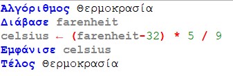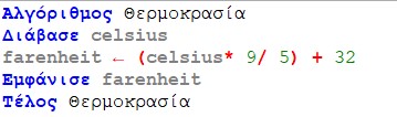 και η λειτουργία της είναι “γίνονται οι πράξεις στην έκφραση και το αποτέλεσμα αποδίδεται, μεταβιβάζεται, εκχωρείται στη μεταβλητή”. Στην εντολή αυτή χρησιμοποιείται το αριστερό βέλος, προκειμένου να δείχνει τη φορά της εκχώρησης. Ας σημειωθεί ότι δεν πρόκειται για εξίσωση, παρ’ όλο που σε άλλα βιβλία μπορεί να χρησιμοποιείται το σύμβολο ίσον “=” για τον ίδιο σκοπό. Ας σημειωθεί επίσης ότι οι διάφορες γλώσσες προγραμματισμού χρησιμοποιούν διάφορα σύμβολα για το σκοπό αυτό. Τέλος ο αλγόριθμος ολοκληρώνεται με την εντολή Εμφάνισε, που αποτυπώνει ένα αποτέλεσμα στην οθόνη. Στον προηγούμενο αλγόριθμο οι μεταβλητές a και b είναι τα δεδομένα που αποτελούν την είσοδο, ενώ η μεταβλητή c αντιπροσωπεύει το αποτέλεσμα, δηλαδή την έξοδο του αλγορίθμου.