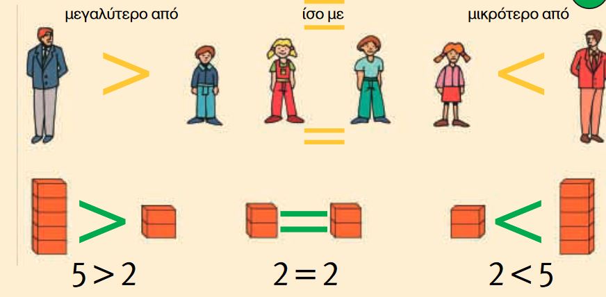 Ας θυμηθούμε τα σύμβολα από τον παρακάτω πίνακα του βιβλίου μας, α΄ τεύχος βιβλίο Μαθηματικών (σελίδα 37). Επίσης θυμηθείτε τα παιχνιδάκια με το μεγάλο ψάρι (π.χ. φάλαινα) που ανοίγει το μεγάλο στόμα του και τρώει τα μικρά ψαράκια. Στη συνέχεια να λύσετε στο τετράδιο εργασιών την παρακάτω άσκηση.