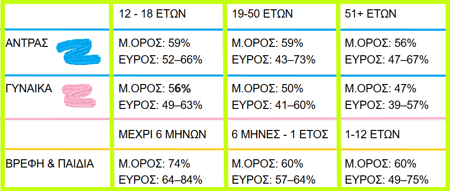 Το ποσοστό του νερού στο σώμα ποικίλλει ελαφρώς, ανάλογα με παράγοντες όπως η ηλικία και το φύλο, αλλά συνήθως είναι εντός του εύρους 45-75%. Υπάρχει περισσότερο νερό στον άπαχο μυ από ό,τι στον λιπώδη ιστό. Συνήθως, ένα γυναικείο σώμα περιέχει μικρότερο ποσοστό νερού από ένα αρσενικό. Αυτό οφείλεται στο ότι οι γυναίκες έχουν μεγαλύτερο ποσοστό λίπους. Αυτή η κατανομή νερού σημαίνει ότι τα άτομα με υψηλότερο ποσοστό σωματικού λίπους είναι πιθανό να έχουν χαμηλότερο ποσοστό νερού στο σώμα τους. Το ποσοστό του νερού στο σώμα αλλάζει με την ηλικία. Τα μωρά έχουν πολύ υψηλό ποσοστό νερού στο σώμα τους, ενώ οι ηλικιωμένοι έχουν λιγότερο. Το μέσο ποσοστό και το εύρος του νερού στο σώμα, ανάλογα με το φύλο και την ηλικία: