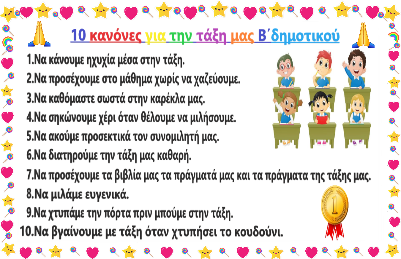 Οι μαθητές πρέπει να γνωρίζουν ποιες είναι οι αναμενόμενες συμπεριφορές από αυτούς μέσα στην τάξη και στο σχολείο γενικότερα. Οι κανόνες δείχνουν τον τρόπο που οι μαθητές πρέπει να συμπεριφέρονται. Είναι κανόνες προτροπής και όχι απαγόρευσης. Παράδειγμα να κάνουμε ησυχία και όχι μην κάνετε φασαρία.... Εμπλέκονται όλοι στη δημιουργία των κανόνων έτσι ώστε να νιώθουν συνυπεύθυνοι για την τήρησή τους!!!