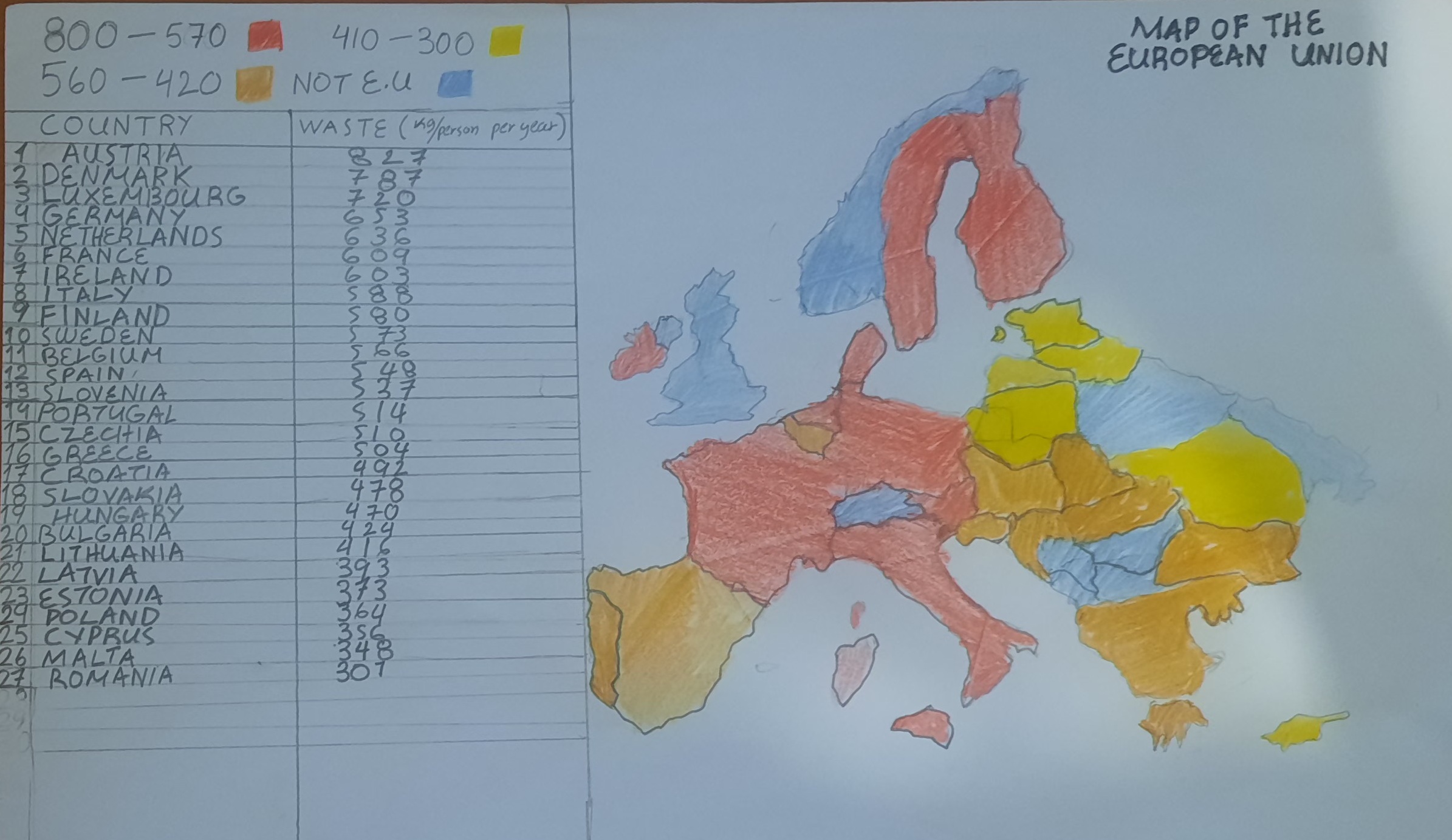 Όταν η ομάδα μας ξεκίνησε να συζητάει πώς θα προσεγγίσουμε το θέμα, ένιωσα ότι ήθελα να κάνω κάτι πιο απτό, κάτι που θα έδειχνε με έναν διαφορετικό τρόπο το μέγεθος του προβλήματος. Έτσι, μου ήρθε η ιδέα να ζωγραφίσω έναν χάρτη της Ευρωπαϊκής Ένωσης, αλλά όχι έναν συνηθισμένο. Ήθελα να δείξω πόσα απορρίμματα παράγει κάθε κάτοικος ανά χώρα, μέσα σε ένα χρόνο.