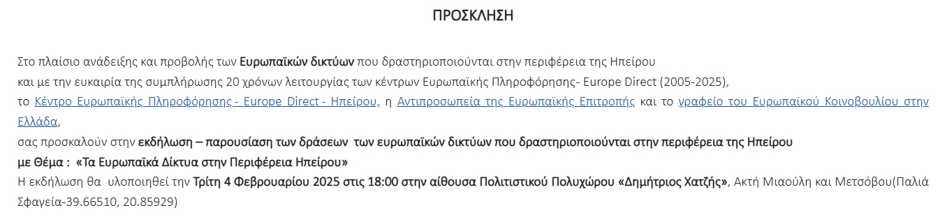 Το 2ο Πειραματικό ΓΕΛ Λευκάδας μετά από πρόσκληση του κ. Δημήτριου Γκόλα, υπεύθυνου του Europe Direct Ηπείρου, συμμετείχε την Τρίτη 4-2-2025 στην εκδήλωση που πραγματοποιήθηκε στα Ιωάννινα με θέμα «Ο ρόλος και η σημασία των Ευρωπαϊκών δικτύων για την υποστήριξη των πολιτών σε τοπικό επίπεδο» που διοργανώθηκε από το Κέντρο Ευρωπαϊκής Πληροφόρησης – Europe Direct Ηπείρου, σε συνεργασία με την Αντιπροσωπεία της Ευρωπαϊκής Επιτροπής και το Γραφείο του Ευρωπαϊκού Κοινοβουλίου.