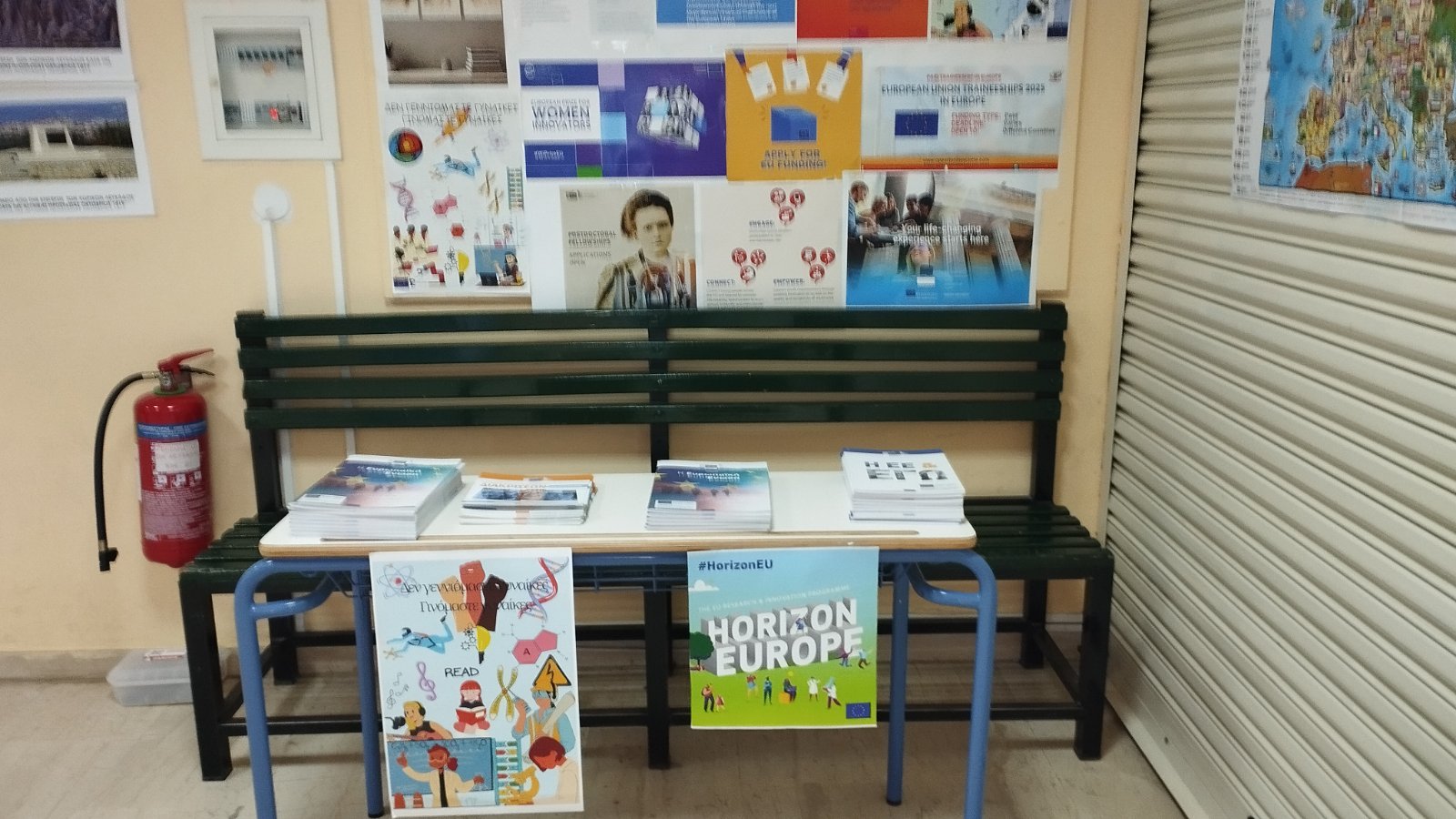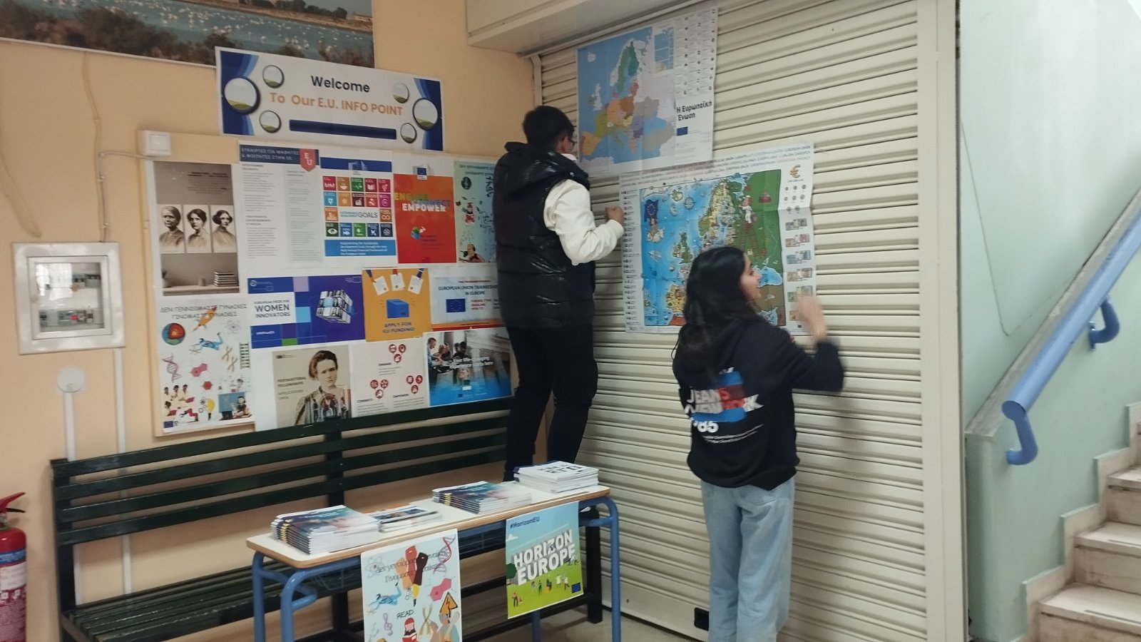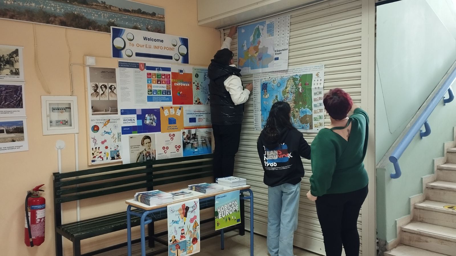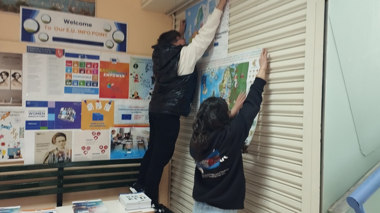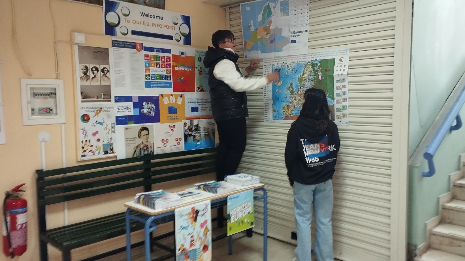 Παράλληλα, αναρτήθηκαν επίσημες αφίσες της Ευρωπαϊκής Ένωσης και ενημερωτικό υλικό για το τι κάνει η Ευρώπη για τους νέους, θέλοντας να ενημερώσουμε και να εμπνεύσουμε τους συμμαθητές μας να συμμετέχουν ενεργά ως Ευρωπαίοι πολίτες.