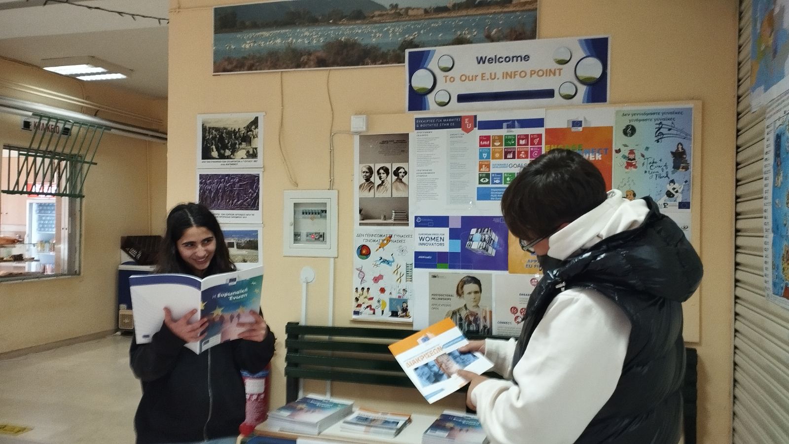 Δημιουργήσαμε επίσης πάγκο ενημέρωσης, στον οποίο τοποθετήσαμε πληροφοριακά έντυπα και εκδόσεις της Ευρωπαϊκής Ένωσης που μας προσέφερε ο υπεύθυνος του Europe Direct Ηπείρου κύριος Γκόλας, τον οποίο ευχαριστούμε θερμά για την υποστήριξή του!