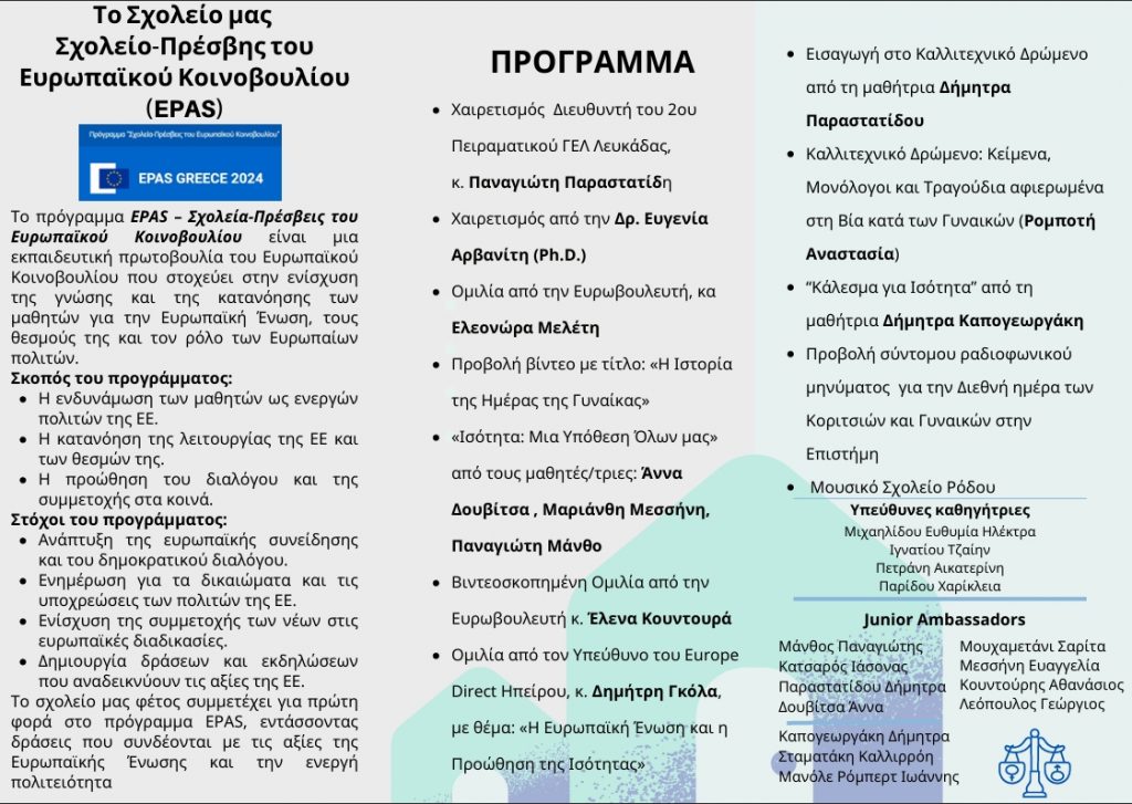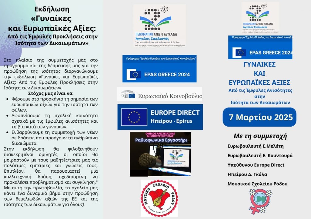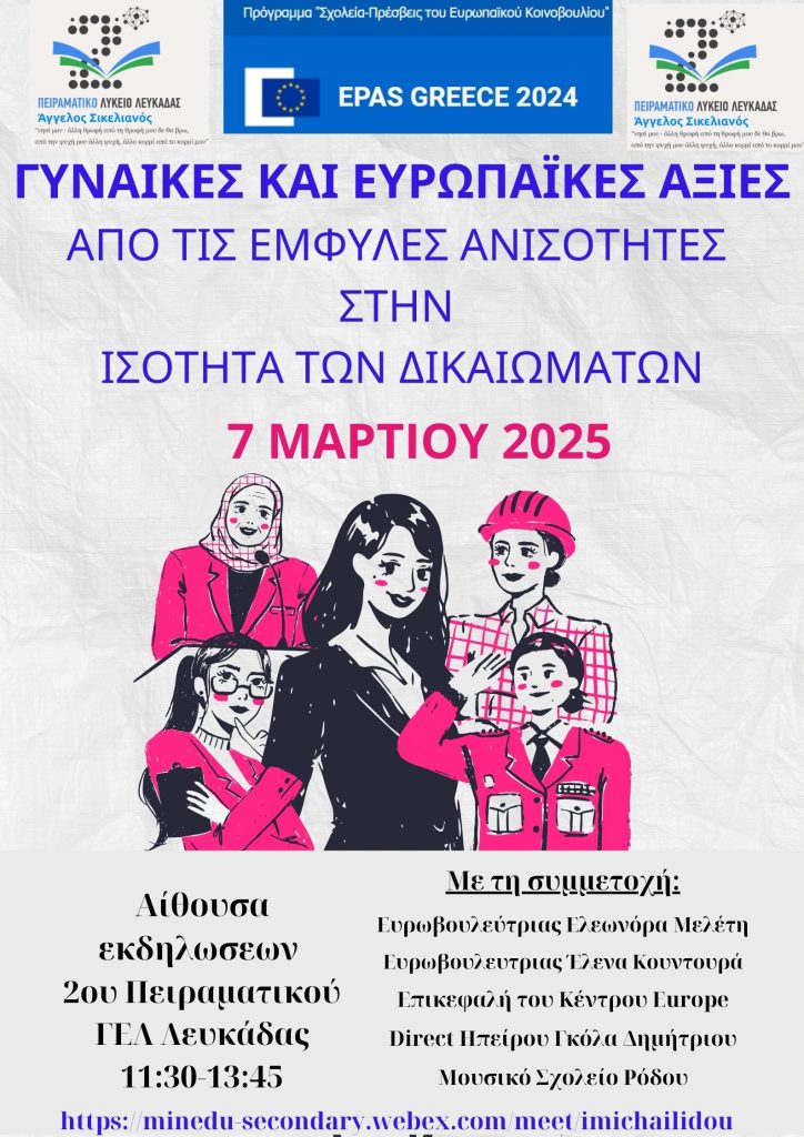 Το 2ο Πειραματικό ΓΕΛ Λευκάδας, στο πλαίσιο του προγράμματος «Σχολεία-Πρέσβεις του Ευρωπαϊκού Κοινοβουλίου», σας προσκαλεί στην εκδήλωση με τίτλο: «Γυναίκες και Ευρωπαϊκές Αξίες: Από τις Έμφυλες Προκλήσεις στην Ισότητα των Δικαιωμάτων», η οποία θα πραγματοποιηθεί την Παρασκευή 7 Μαρτίου 2025, από τις 11:30 έως τις 13:45, στην αίθουσα εκδηλώσεων του σχολείου.