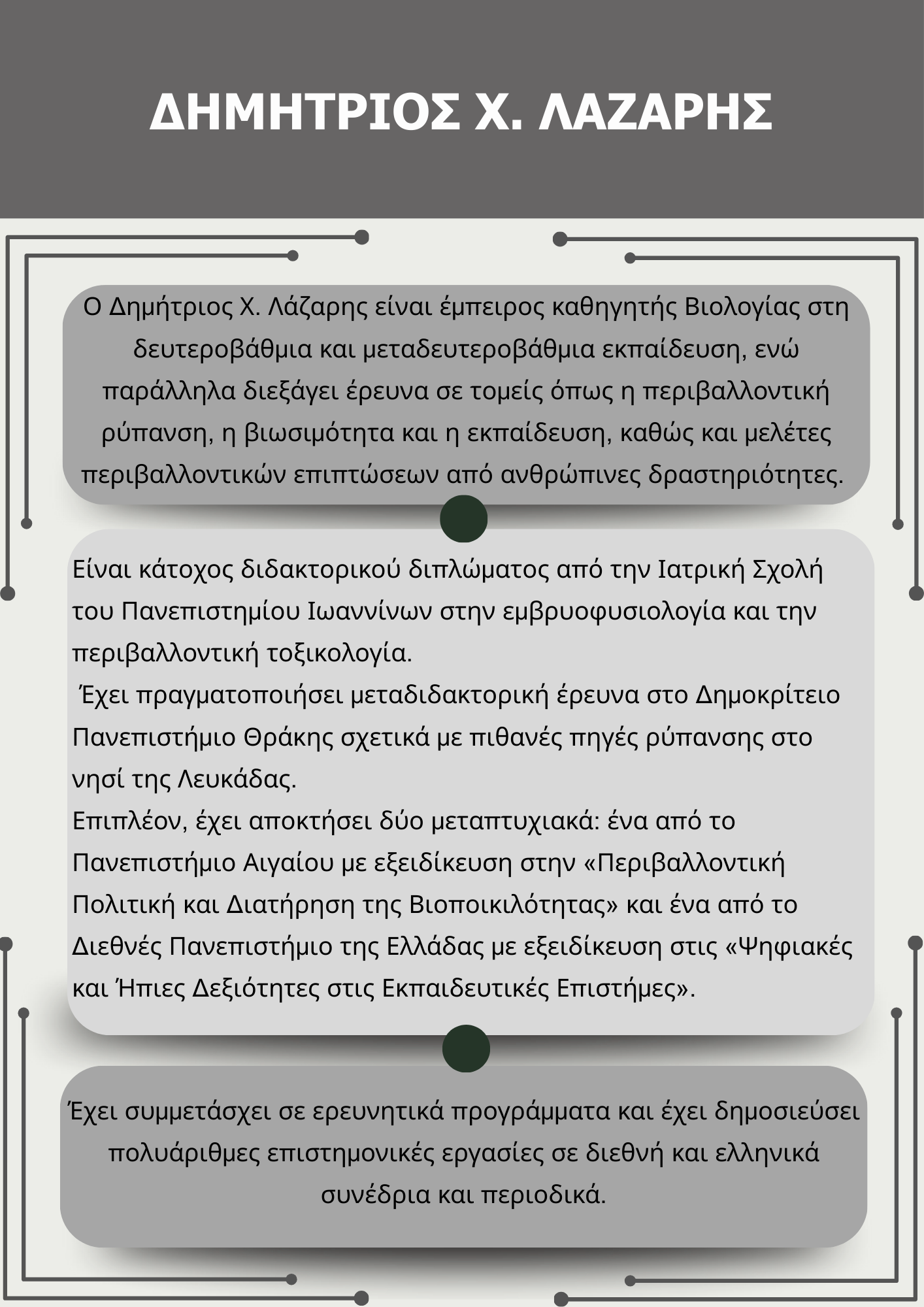Με πλούσιο ερευνητικό έργο και πολυετή διδακτική εμπειρία, ο κ. Λάζαρης μας μίλησε για την πορεία του, την αφοσίωσή του στα περιβαλλοντικά ζητήματα και τη σημασία της εκπαίδευσης στην καταπολέμηση της κλιματικής αλλαγής.
