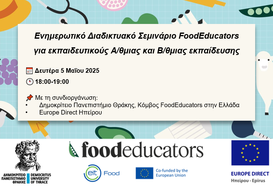Το Δημοκρίτειο Πανεπιστήμιο Θράκης, ως Κόμβος EIT Food και Κόμβος FoodEducators στην Ελλάδα, σε συνεργασία με το Europe Direct Ηπείρου, προσκαλεί τους εκπαιδευτικούς της Πρωτοβάθμιας και Δευτεροβάθμιας Εκπαίδευσης της Π. Ηπείρου σε ενημερωτικό διαδικτυακό σεμινάριο με αντικείμενο τη διδασκαλία θεμάτων που σχετίζονται με τη διατροφή.