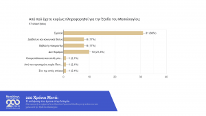 Ένα ακόμη σημαντικό εύρημα είναι ότι οι περισσότεροι μαθητές δήλωσαν ότι η κύρια πηγή από την οποία έμαθαν για την Έξοδο είναι το σχολείο. Πολύ λιγότεροι ανέφεραν άλλες πηγές, όπως βιβλία, ντοκιμαντέρ ή προσωπική έρευνα. Αυτό δείχνει ότι η γνώση των μαθητών βασίζεται σχεδόν αποκλειστικά στη σχολική διδασκαλία και δεν ενισχύεται επαρκώς από άλλες μορφές μάθησης.