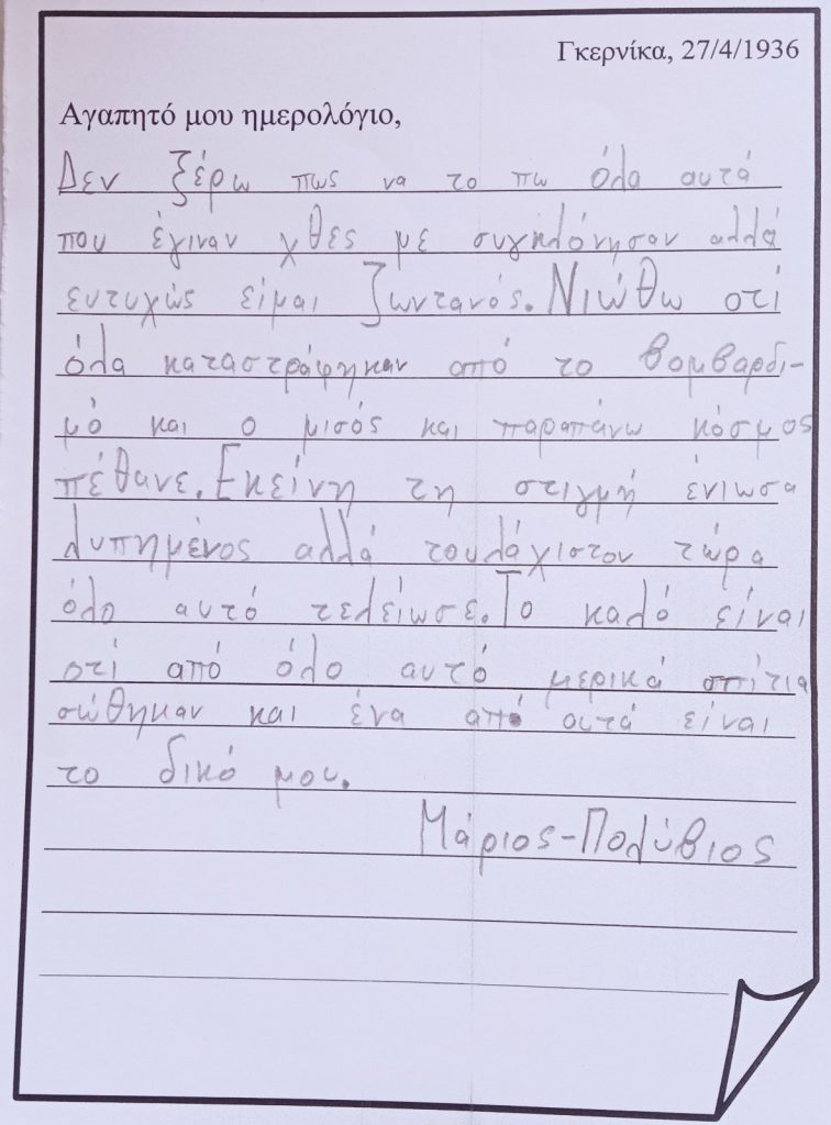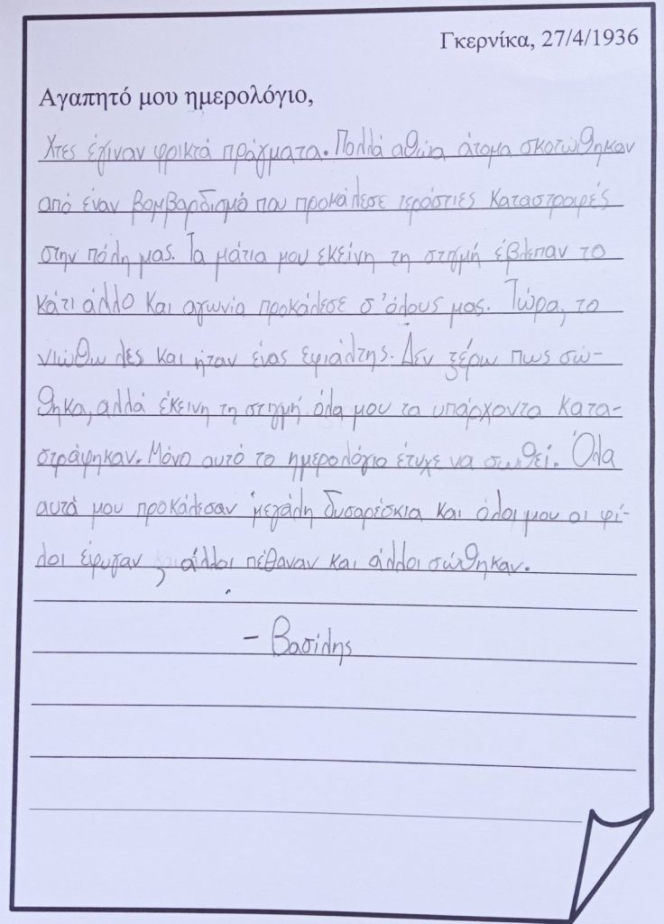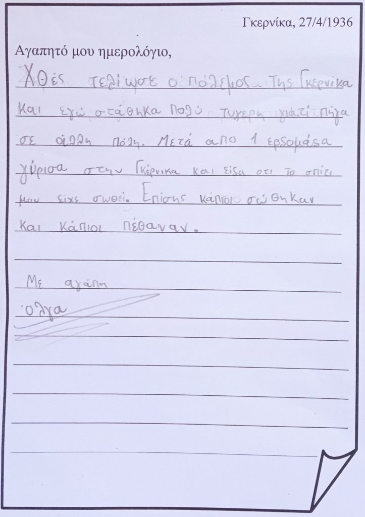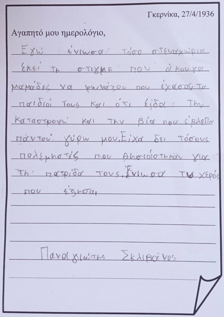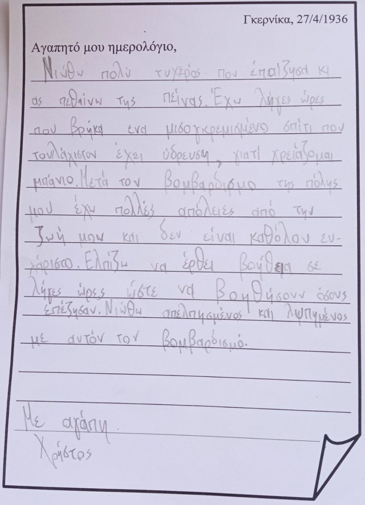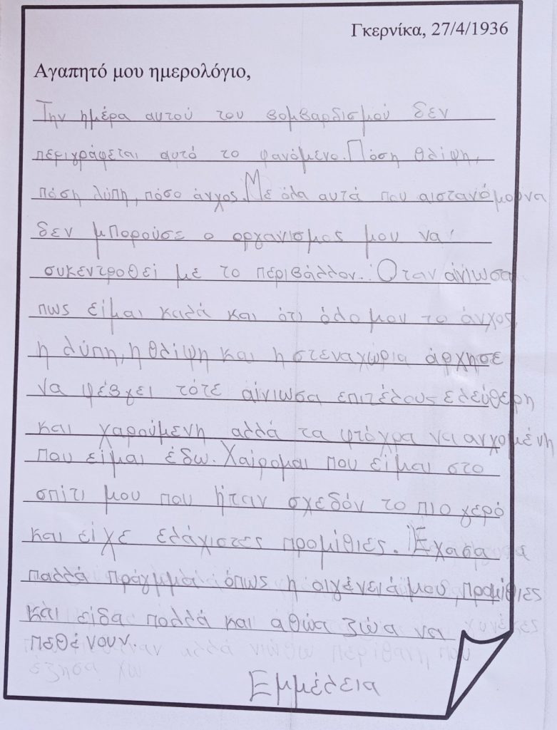 ...και "μπαίνω" μέσα στον πίνακα. Φαντάζομαι τον εαυτό μου σαν ένα παιδί που κατάφερε να επιζήσει από τον βομβαρδισμό και καταγράφω στο ημερολόγιό μου την εμπειρία μου, τις σκέψεις και τα συναισθήματά μου: