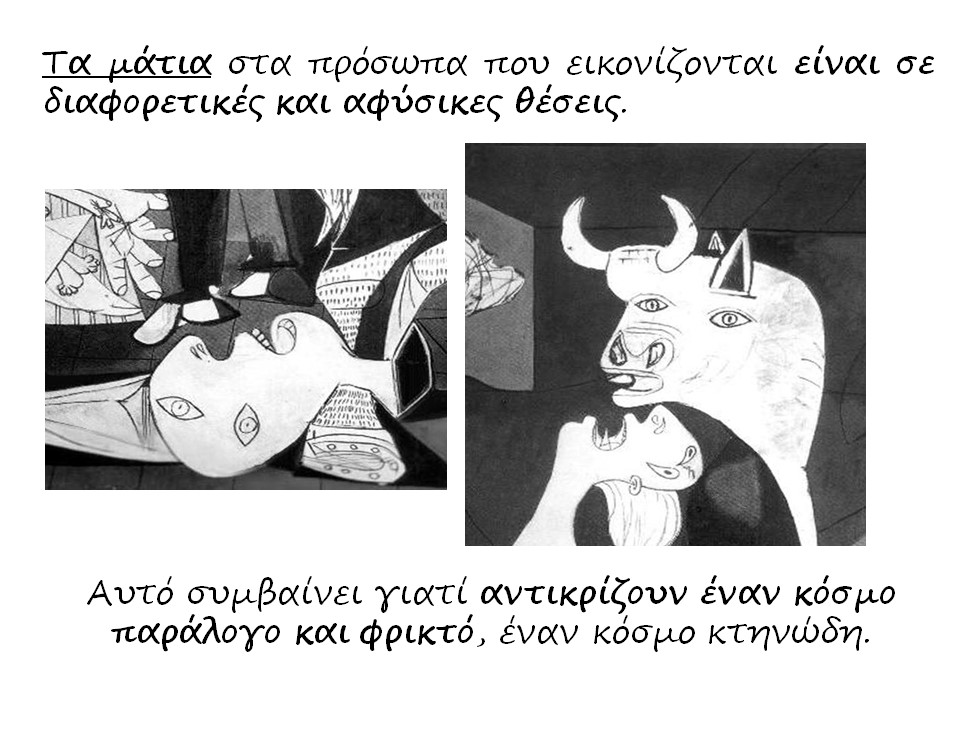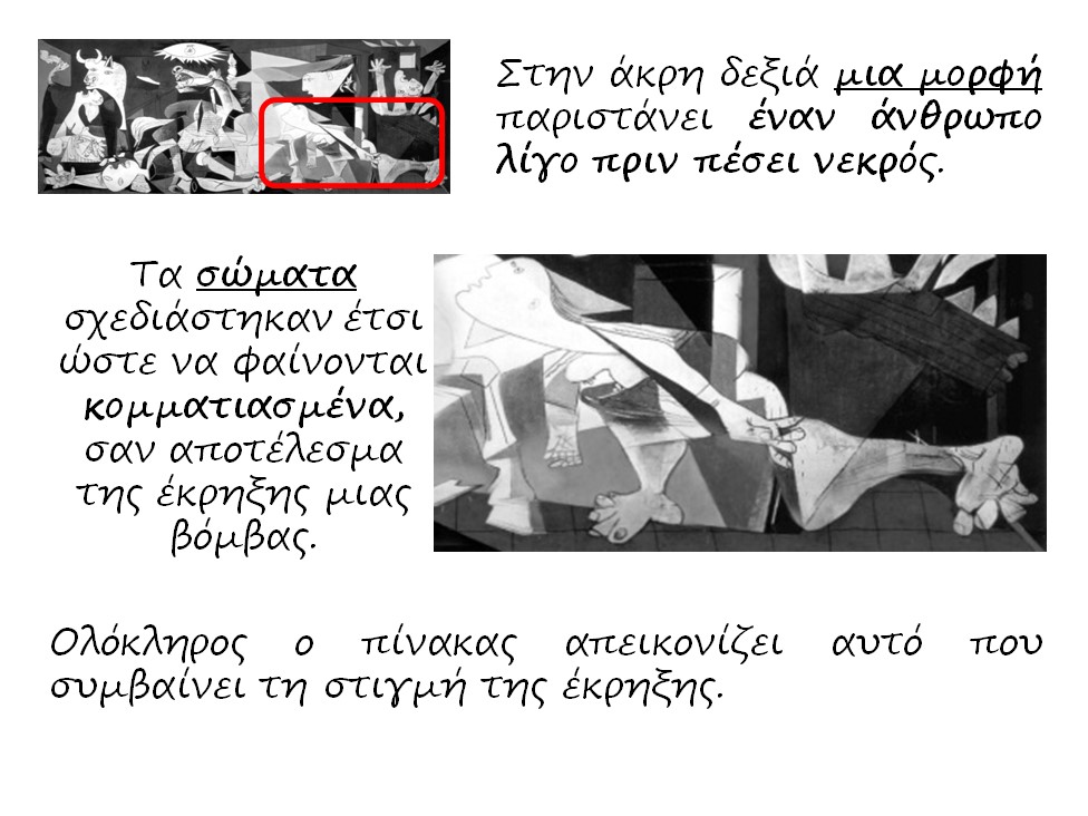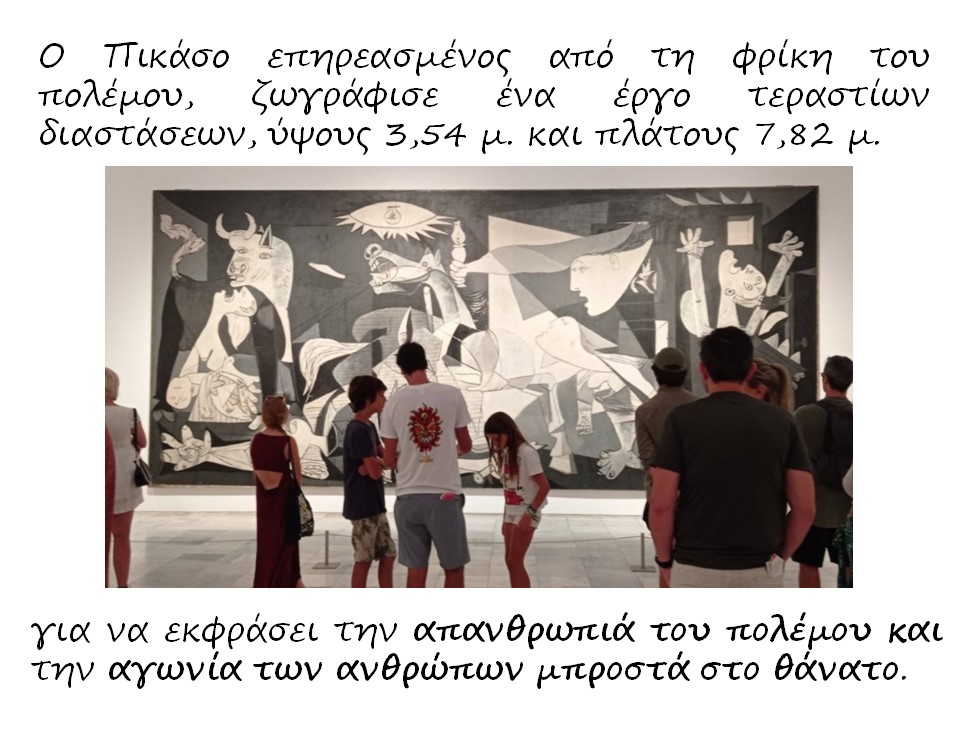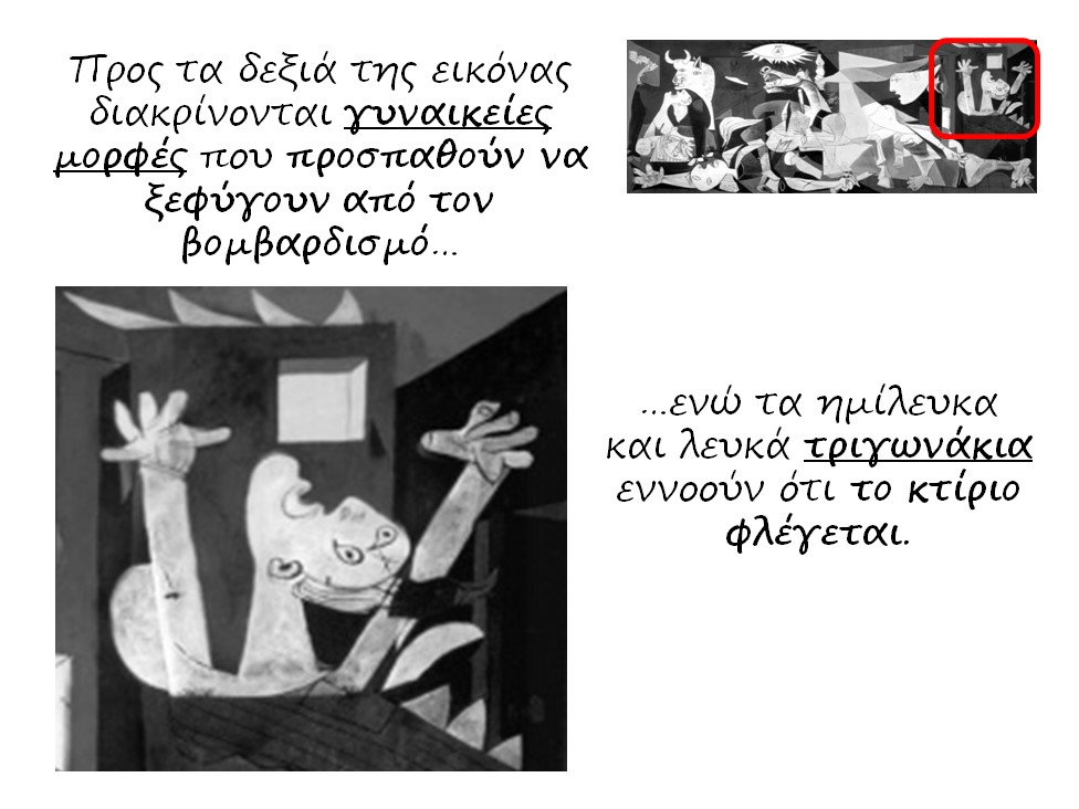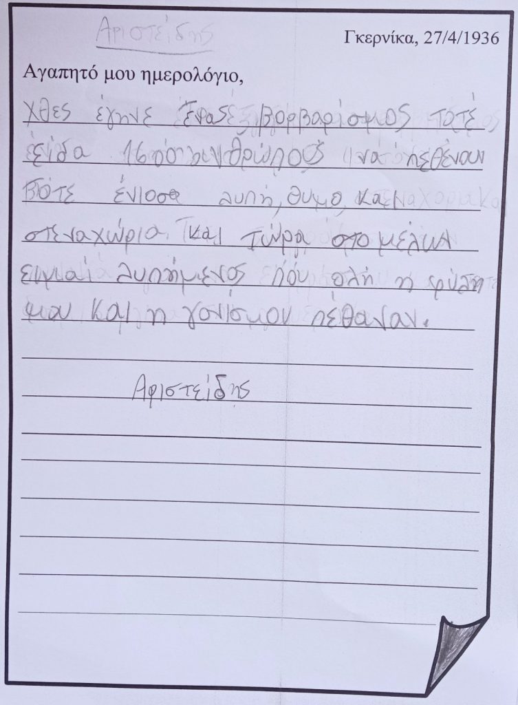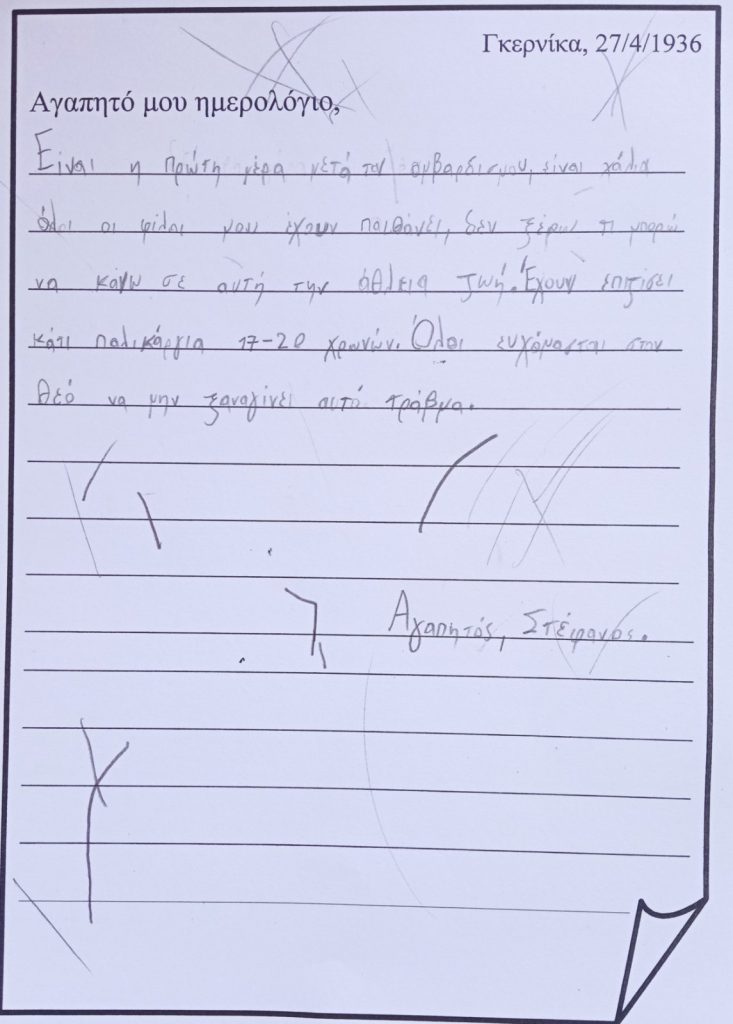 ...και "μπαίνω" μέσα στον πίνακα. Φαντάζομαι τον εαυτό μου σαν ένα παιδί που κατάφερε να επιζήσει από τον βομβαρδισμό και καταγράφω στο ημερολόγιό μου την εμπειρία μου, τις σκέψεις και τα συναισθήματά μου: