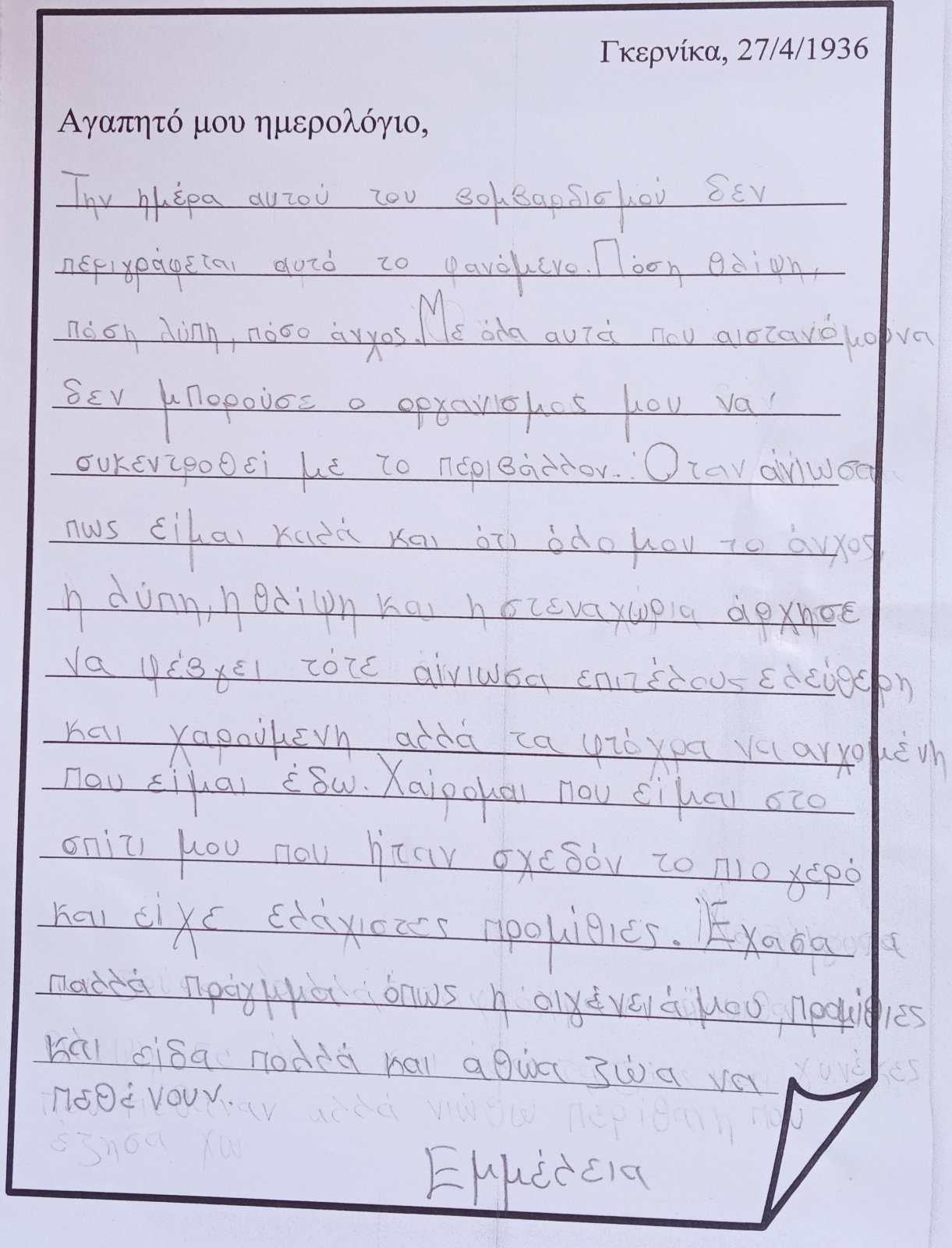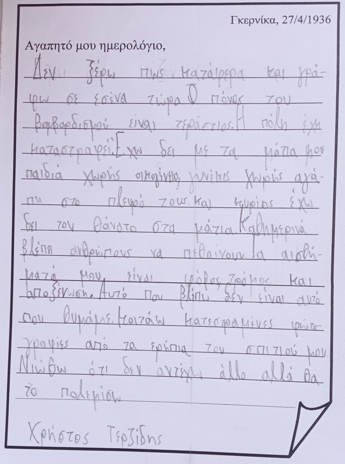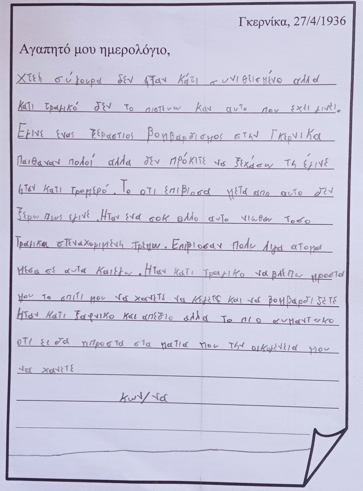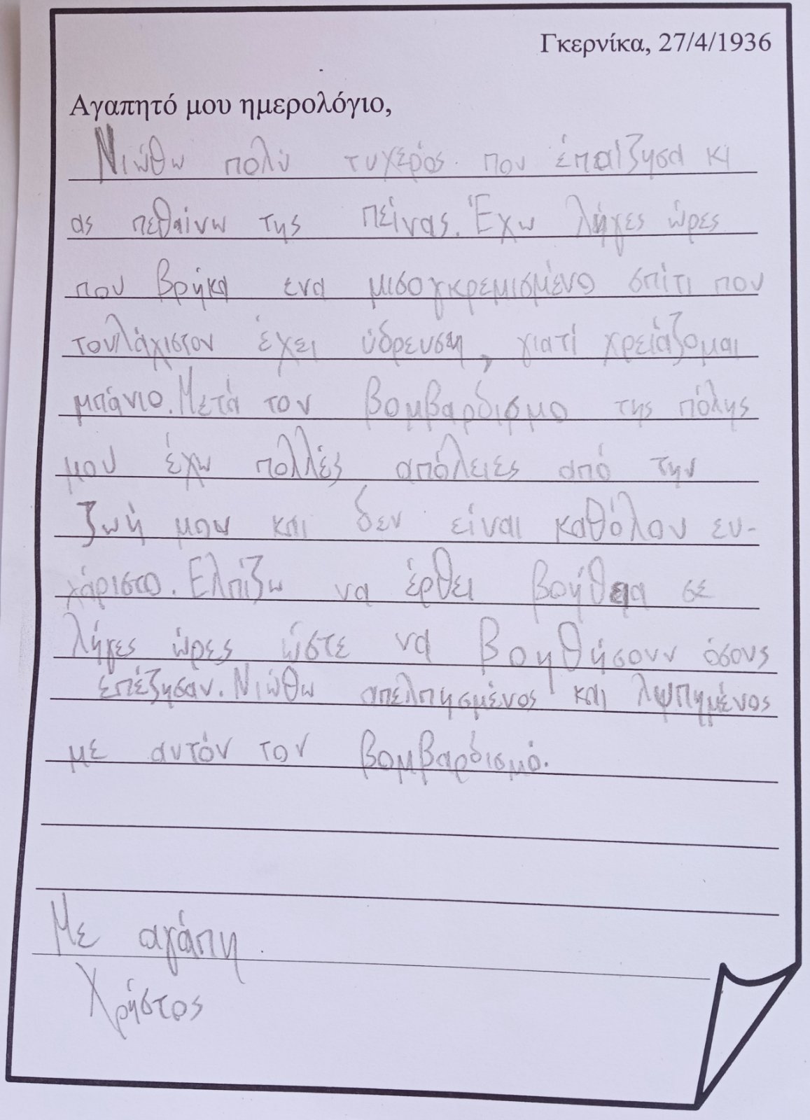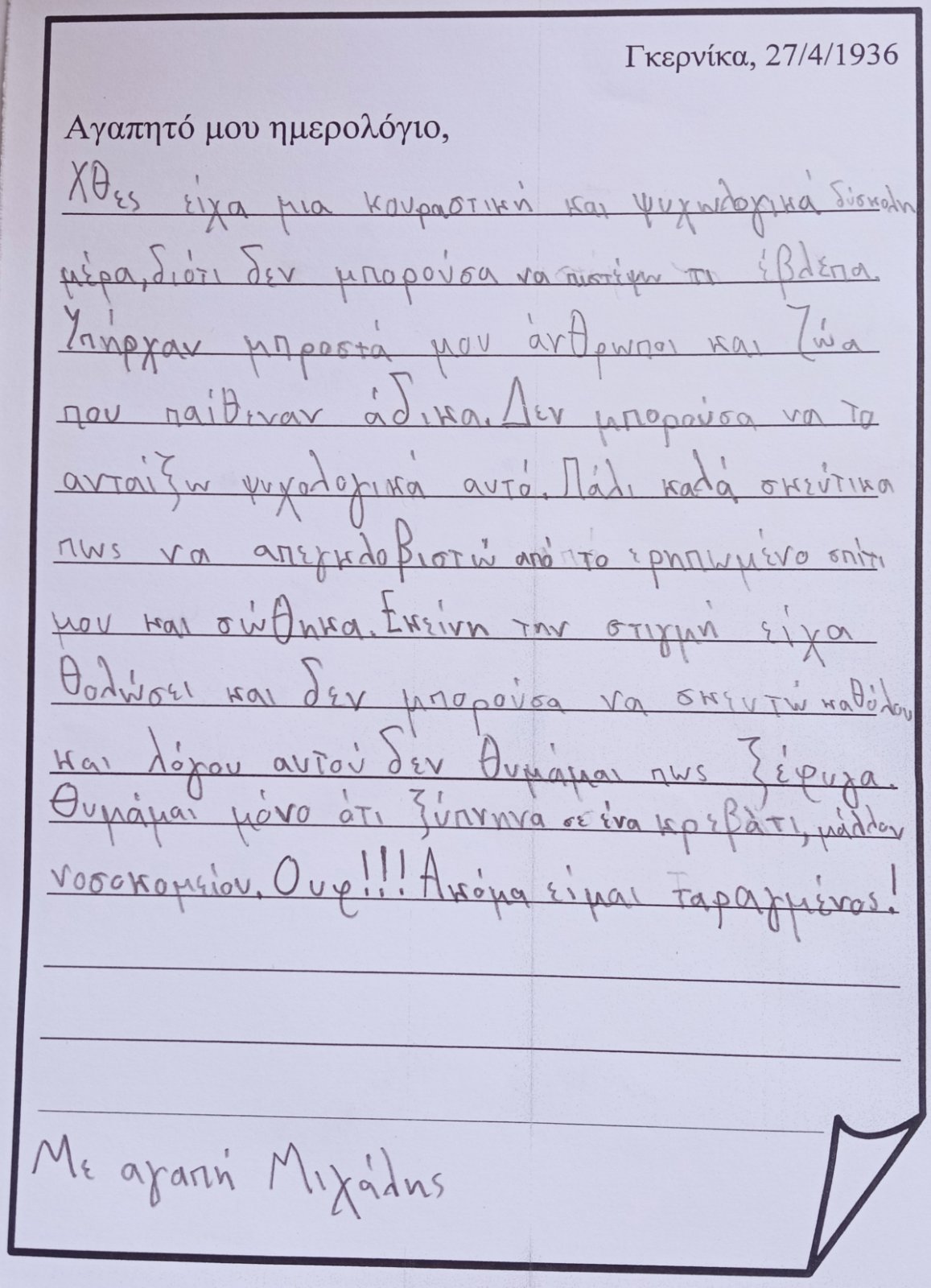 ...και "μπαίνω" μέσα στον πίνακα. Φαντάζομαι τον εαυτό μου σαν ένα παιδί που κατάφερε να επιζήσει από τον βομβαρδισμό και καταγράφω στο ημερολόγιό μου την εμπειρία μου, τις σκέψεις και τα συναισθήματά μου: