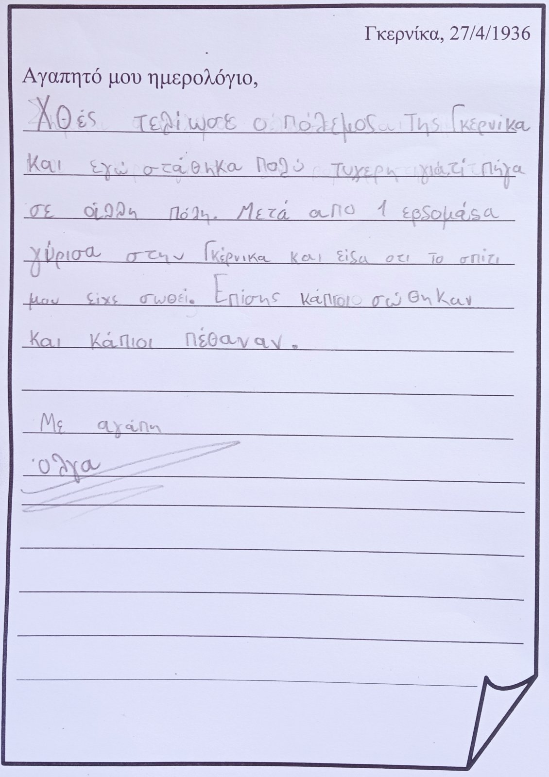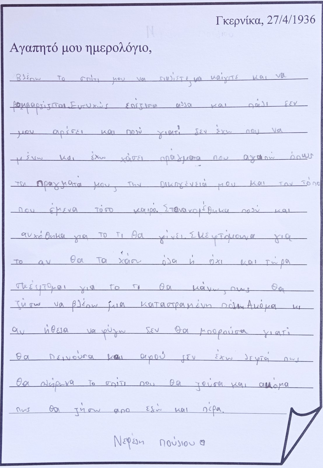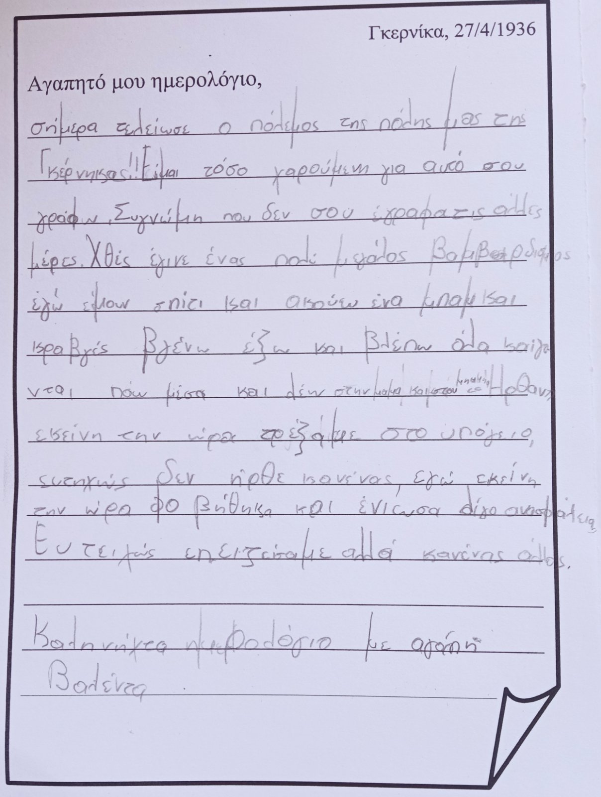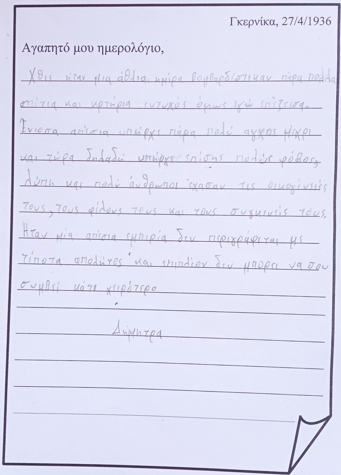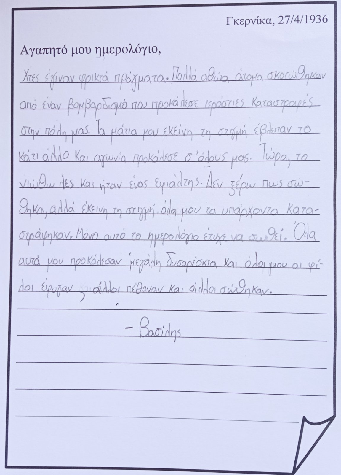 ...και "μπαίνω" μέσα στον πίνακα. Φαντάζομαι τον εαυτό μου σαν ένα παιδί που κατάφερε να επιζήσει από τον βομβαρδισμό και καταγράφω στο ημερολόγιό μου την εμπειρία μου, τις σκέψεις και τα συναισθήματά μου: