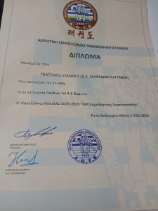 Ο μαθητής της Α΄τάξης του 2ου Γυμνασίου Λαγκαδά, Γκαϊτίνης Ιωάννης, είναι αθλητής στο Σύλλογο «Μακεδών» Λαγυνών στο Taekwon-do. Στις 28 Νοεμβρίου 2025 κατέλαβε την 3η θέση στο πανελλήνιο πρωτάθλημα Παμπαίδων Μάχης – 30 kg καθώς και την 1η θέση στην κατηγορία Παμπαίδων Tul 4-3 Gup. Πρόσφατα, στις 17 Ιανουαρίου 2026, επιβεβαίωσε τις λαμπρές του επιδόσεις καταλαμβάνοντας και πάλι την 1η θέση στο Β Πανελλήνιο κύπελο στην κατηγορία Παμπαίδων Tul 4-3 Gup. Το σχολείο σύσσωμο – καθηγητές και μαθητές - τον χειροκροτήσαμε τις επόμενες μέρες στην πρωινή συγκέντρωση. Ευχόμαστε να συνεχίζει να αγωνίζεται και να έχει επιτυχίες! Πολλά συγχαρητήρια, Γιάννη!