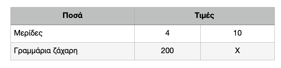Μια συνταγή για κέικ αναφέρει ότι για 4 μερίδες χρειαζόμαστε 200 γραμμάρια ζάχαρη. Πόσα γραμμάρια ζάχαρη θα χρειαστούμε αν θέλουμε να φτιάξουμε 10 μερίδες;