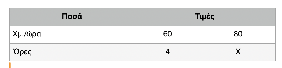 Ένα αυτοκίνητο που κινείται με σταθερή ταχύτητα 60 χλμ/ώρα χρειάζεται 4 ώρες για να καλύψει μια απόσταση. Πόσες ώρες θα χρειαζόταν για την ίδια απόσταση αν η ταχύτητά του ήταν 80 χλμ/ώρα;