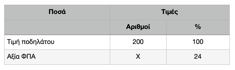 1. Φτιάχνουμε τον πίνακα. Προσέχουμε να βάλουμε τους αριθμούς στη μία στήλη των Τιμών και τα ποσοστά στην άλλη. Σκεφτόμαστε: Η τιμή του ποδηλάτου (αρχική τιμή) είναι 200€ και αντιστοιχεί στο 100%. Εμείς ψάχνουμε την αξία του ΦΠΑ (του 24%).