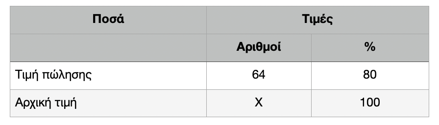 Εδώ ξέρουμε την τιμή "μετά" την αλλαγή και θέλουμε να βρούμε το αρχικό μας 100%, το οποίο είναι και ο άγνωστος .