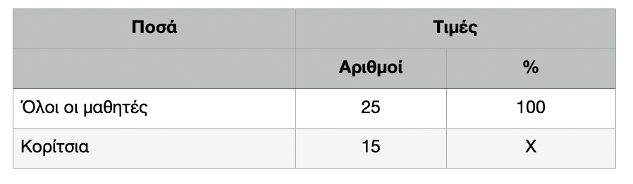 Εξήγηση: Το σύνολο των μαθητών (25 άτομα) αντιστοιχεί στο 100%. Εμείς ψάχνουμε το ποσοστό που αντιστοιχεί στα 15 κορίτσια.