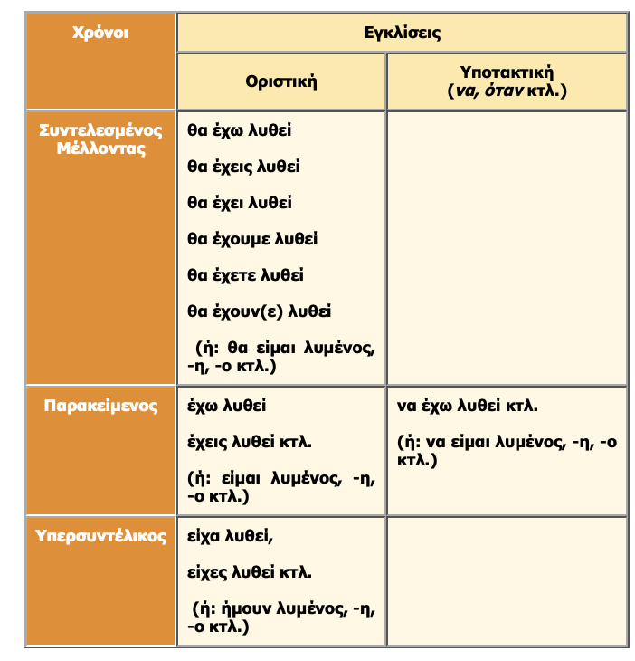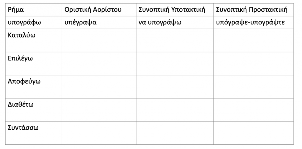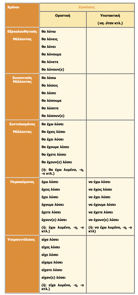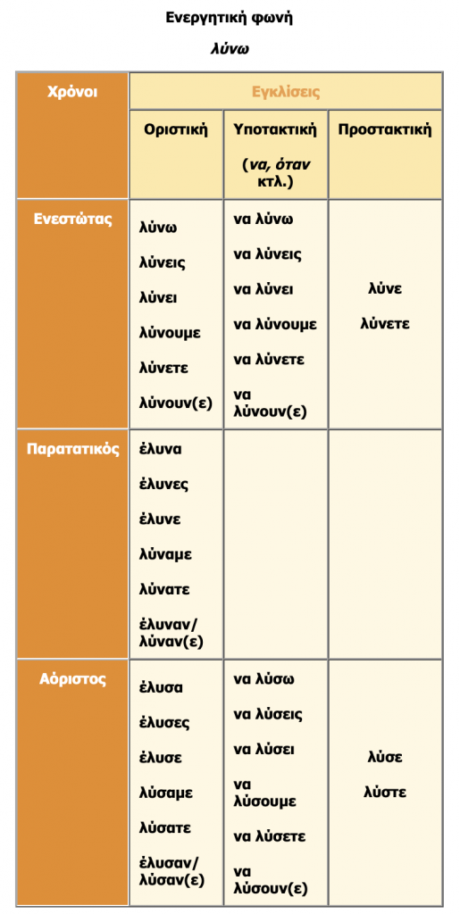 Παράδειγμα κλίσης ρημάτων από το βιβλίο Γραμματικής Α' Γυμνασίου. Προσέχουμε ότι οι Εξακολουθητικές εγκλίσεις (Υποτακτική και Προστακτική) αναφέρονται ως: Υποτακτική και Προστακτική Ενεστώτα και οι Συνοπτικές εγκλίσεις ως: Υποτακτική και Προστακτική Αορίστου.