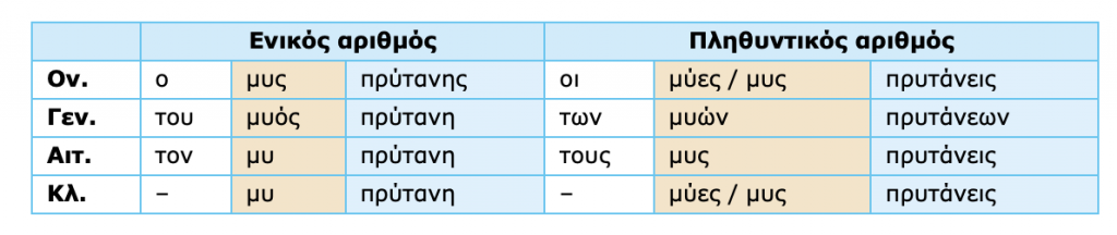 Τα ουσιαστικά είναι εύκολα. Αν για κάποιο δεν είμαστε σίγουροι, το βρίσκουμε στη Γραμματική. Βοήθεια θα ανεβάσω εδώ μόνο για τέσσερα, που είναι διαφορετικά από τα υπόλοιπα: "ο πρέσβης" κλίνεται όπως "ο πρύτανης" και "ο μυς" με δικό του τρόπο που θα πρέπει να τον μάθουμε. Δείτε τους πίνακες από τη Γραμματική.