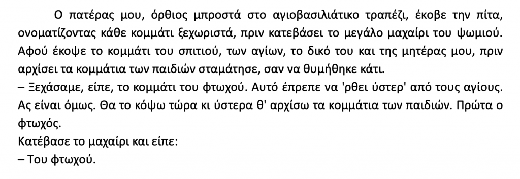 Ο πατέρας μου, όρθιος μπροστά στο αγιοβασιλιάτικο τραπέζι, θακόβει [ή θα κόψει] την πίτα, [...] πριν κατεβάσει το μεγάλο μαχαίρι του ψωμιού.
