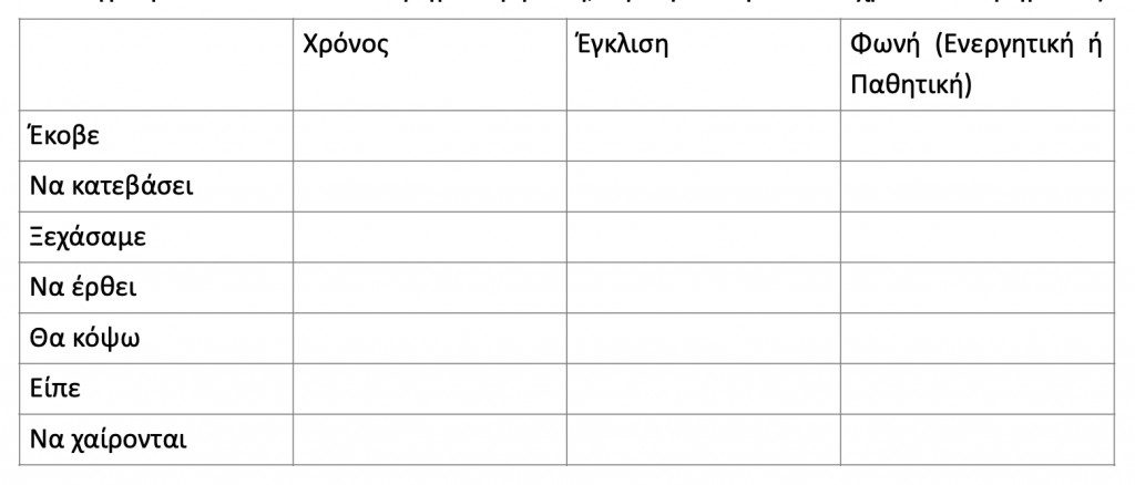 Εδώ πρέπει απλά να βρούμε τον χρόνο, την έγκλιση και τη φωνή κάθε ρήματος. Για να βρούμε τη Φωνή σκεφτόμαστε δύο πράγματα: