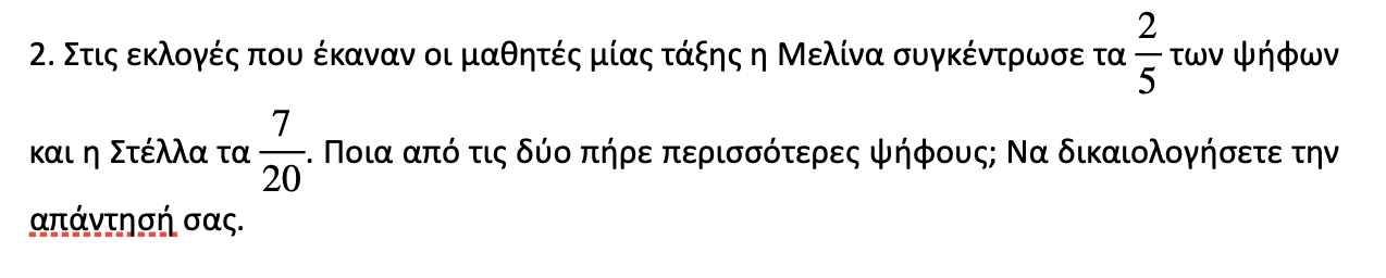 Πρέπει να συγκρίνουμε τις ψήφους που πήραν η Μελίνα και η Στέλλα. Όμως, δεν μπορούμε να συγκρίνουμε τα κλάσματα 2/5 και 7/20 επειδή δεν είναι ομώνυμα. Άρα, πρέπει να τα κάνουμε ομώνυμα, υπολογίζοντας το Ε.Κ.Π.