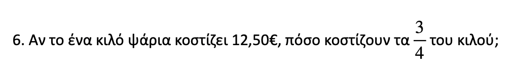 Ξέρουμε πόσο κοστίζει το 1 κιλό (τα 4/4) και ψάχνουμε τα 3/4. Θα κάνουμε πολλαπλασιασμό.