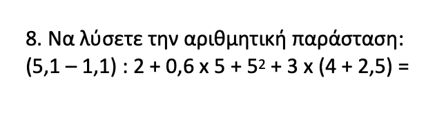 Για να λύσουμε μία αριθμητική παράσταση πρέπει απλά να κάνουμε τις πράξεις με τη σωστή σειρά. Εδώ ξεκινάμε με τις παρενθέσεις, στη συνέχεια κάνουμε τις πράξεις, ξεκινώντας από τη δύναμη.