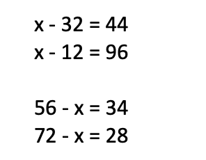 Αυτές είναι εξισώσεις που έχουμε κάνει. Επειδή είναι προσθέσεις, για να υπολογίσουμε το x μπορούμε να κάνουμε την αντίστροφη πράξη (αφαίρεση).
