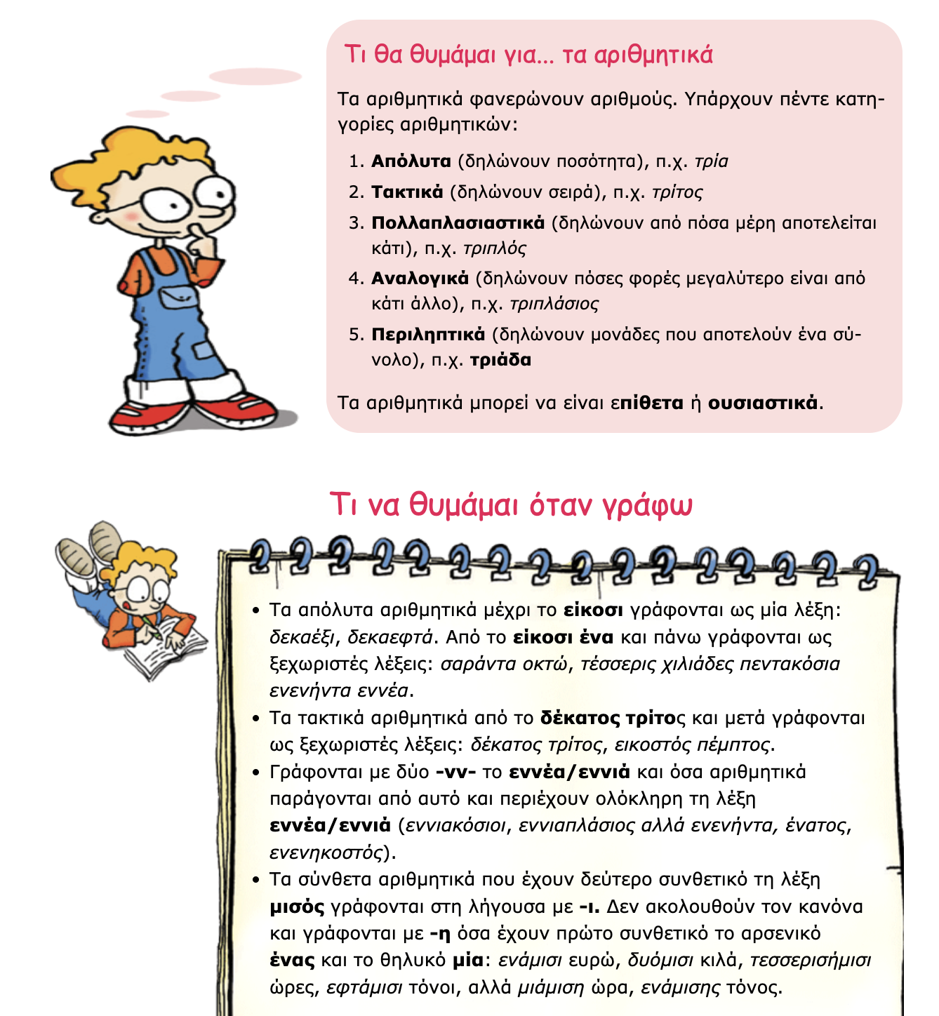 Πληροφορίες για τα αριθμητικά μπορούμε να βρούμε στο βιβλίο της Γραμματικής κάνοντας κλικ εδώ.