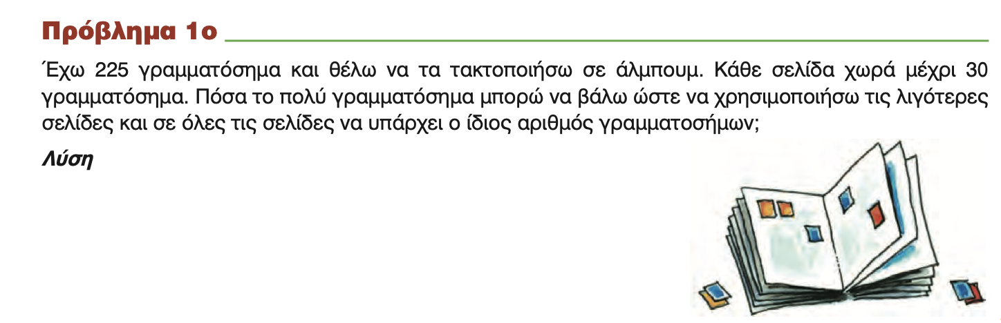 Δ (225): 1, 2, 3, 5, 9, 15, 25 και άλλοι που όμως είναι μεγαλύτεροι από το 30, οπότε δεν τους χρειαζόμαστε. Άρα, ο μεγαλύτερος αριθμός γραμματοσήμων που μπορούμε να βάλουμε σε κάθε σελίδα είναι 25.