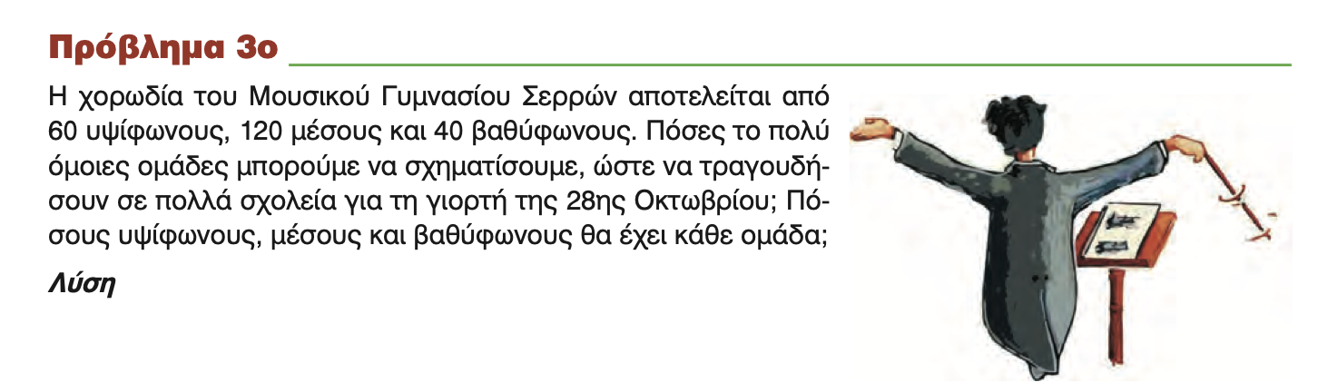 Αφού βρούμε τον Μ.Κ.Δ. θα ξέρουμε σε πόσες ομάδες θα μπορούν να μοιραστούν οι "τραγουδιστές". Με μία διαίρεση θα μπορούμε να βρούμε πόσοι υψίφωνοι, μέσοι ή βαθύφωνοι θα μπουν σε κάθε ομάδα...