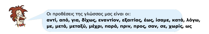 Προσοχή, προσοχή! Δεν μπερδεύουμε τις προθέσεις με τους εμπρόθετους προσδιορισμούς: Οι προθέσεις είναι οι λεξούλες που μάθαμε παραπάνω. Οι εμπρόθετοι προσδιορισμοί είναι λεξούλες που σχηματίζουμε με τις προθέσεις + κάποιο ουσιαστικό και δηλώνουν κάτι (χρόνο, τόπο, τρόπο, αιτία κτλ.).