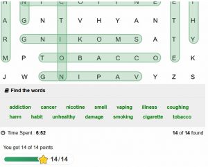 Οι μαθητές συμμετείχαν στις δραστηριότητες του Προγράμματος Αγωγής Υγείας , εντοπίζοντας τους όρους του κρυπτόλεξου που σχετίζονται με το πρόγραμμα «Σχολεία Χωρίς Καπνό», μια δραστηριότητα που αποτελεί έναν ευχάριστο και δημιουργικό τρόπο μάθησης.