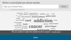 As a starting point for the project, the students recorded on the above board the first word or phrase that came to their mind when they heard the word "TOBACCO", spontaneously capturing their initial thoughts and perceptions.