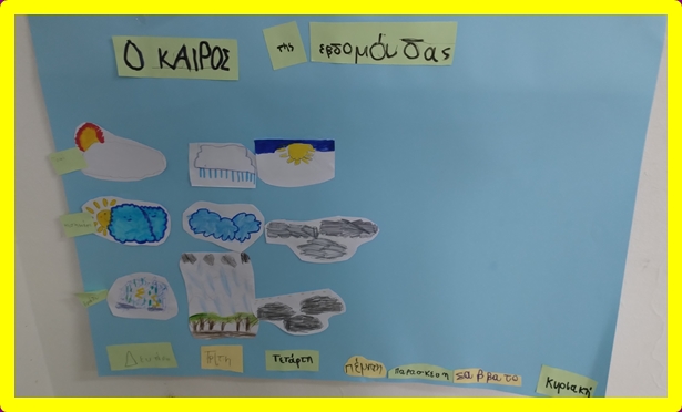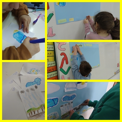 Ξεκινήσαμε τη Δευτέρα με τη δημιουργία ενός ομαδικού πίνακα για την καταγραφή του καιρού. Κάθε μέρα 3 παιδιά είχαν το καθήκον να ζωγραφίσουν τον καιρό που αντιστοιχούσε στη φάση της ημέρας (πρωί, μεσημέρι, βράδυ) που ανέλαβαν! Ο πίνακάς μας θα ολοκληρωθεί πλήρως τη Δευτέρα 16/2 όταν θα κολλήσουμε και τον καιρό αυτού του Σαββατοκύριακου! Μετά την καταγραφή των δεδομένων της εβδομάδας, θα ακολουθήσει καταμέτρηση και εξαγωγή συμπερασμάτων ! Ευτυχώς για μας αυτήν την εβδομάδα είχαμε ποικιλία καιρικών συνθηκών!!!