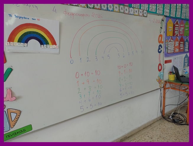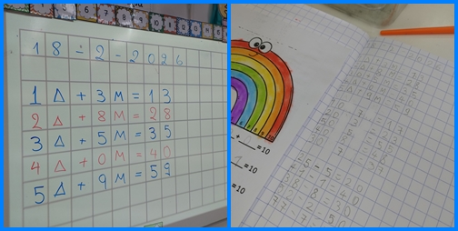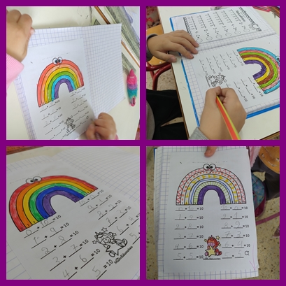 Στα Μαθηματικά συνεχίσαμε με ουράνια τόξα και υπενθύμιση των ζευγαριών του 10! Χρωματίσαμε στα τετράδια μας και μιλήσαμε ξανά για τη δυνατοτητα αναστροφής που έχουν οι αριθμοί στην πρόσθεση (αντιμεταθετική ιδιότητα).