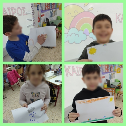 Μάλιστα, ζωγραφίσαμε τις καιρικές συνθήκες που μας αρέσουν περισσότερο και κάποιοι πρόλαβαν και να τις παρουσιάσουν στην ολομέλεια!Από εδώ και πέρα θα παρατηρούμε περισσότερο την καιρό καθημερινά και θα κρατάμε στοιχεία και στην τάξη μας! Επιπλέον, σταθήκαμε περισσότερο στα συναισθήματα που μας προκαλούν αυτές οι συνθήκες: