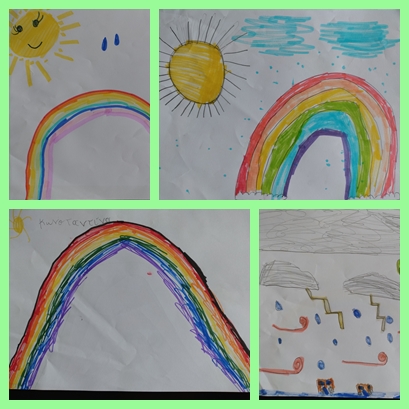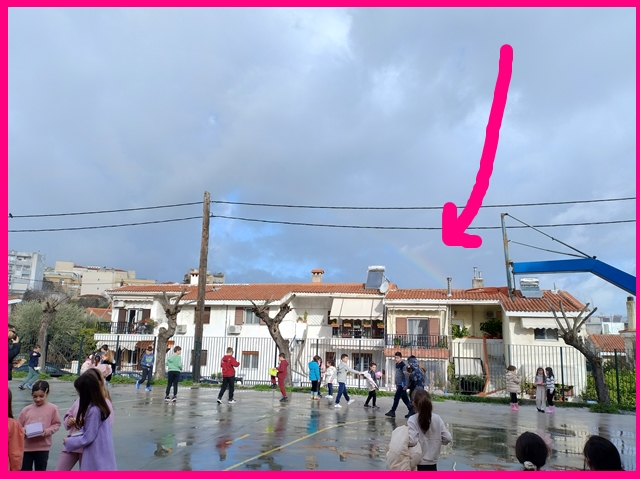 Και σαν να μας ακουσαν οι ουρανοί και ήρθε η ώρα να αντικρύσουμε ένα αληθινό ουράνιο τόξο στην αυλή μας την Παρασκευή!Χαρά και ενθουσιασμός... και ήταν η τέλεια ευκαιρία (αλήθεια ούτε προγραμματισμένο να το είχαμε) για τη συζήτηση που ξεκινήσαμε στη Μελέτη: Ήλιος και καιρικές συνθήκες!